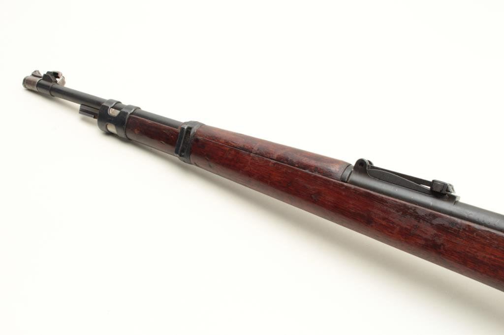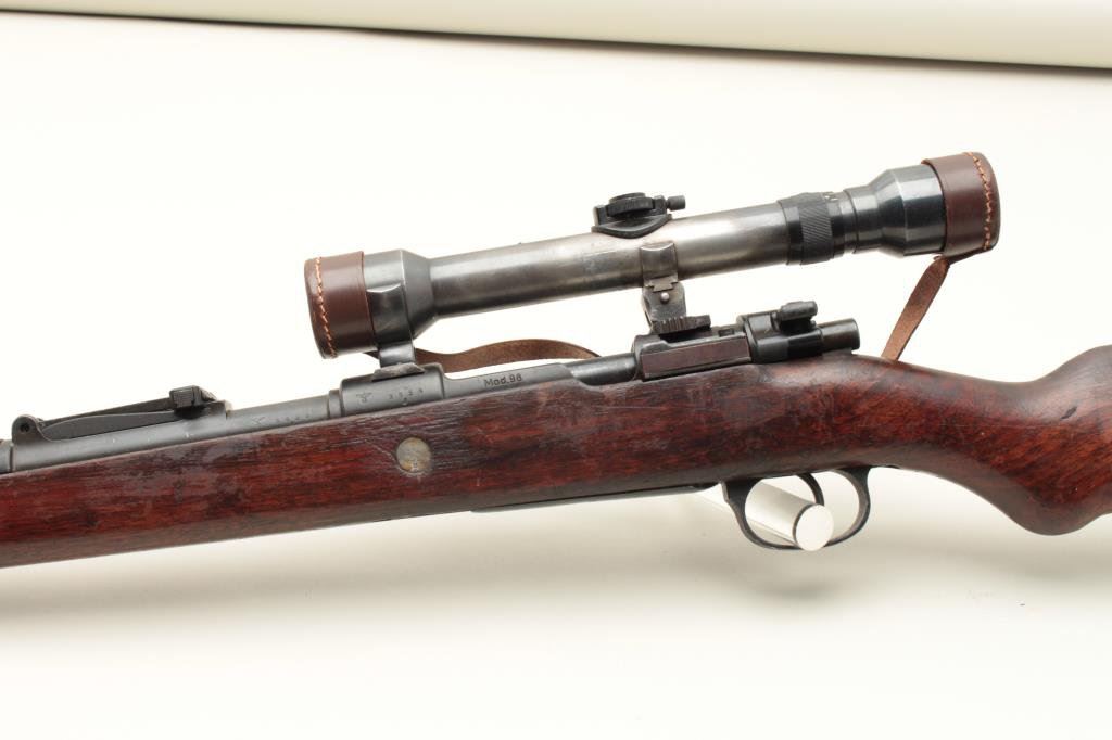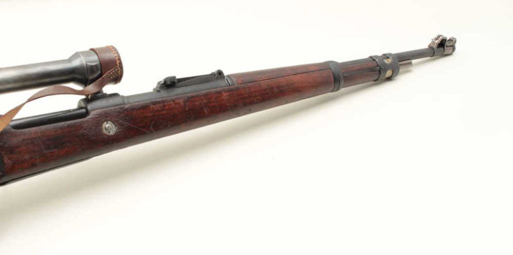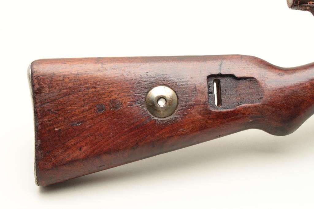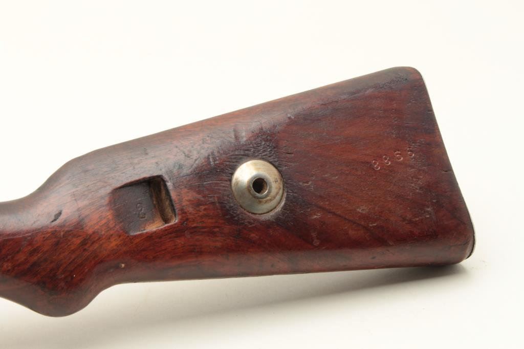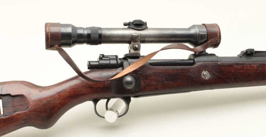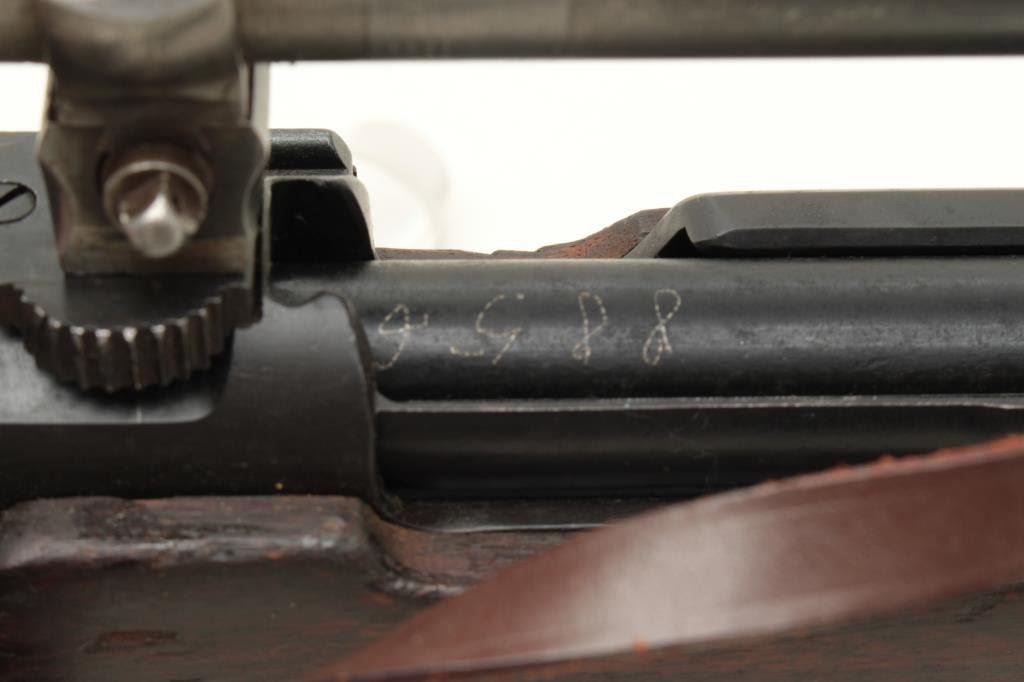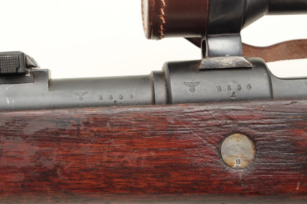 the breech (Mauser) and dated 1938, S/N 8856. The bolt shows “1” assembly number or special work number and safety shows #3313. The floor plate shows #8259. The barrel matches and the front band is #711. The stock shows “H” and two eagles with “Wa A9” stamped in the wood with remnants of eagle and same “Wa A9” behind the trigger guard. Other number stamps including 8856 on the left side of the receiver and the barrel number. Mounted on quick release mount with see through for iron sights. The scope is marked “Henzolt-Wetzlar” and “Dialitan 4x Nr52068”. Nazi proofs with 3 eagles on the right side of the breech, 1 on action, and 1 on the barrel. Shows import marks. 75%-85% arsenal type old re-blued finish going to patina. The stock is good with dings, mars and scratches. The bore is very good and the scope is clear. Possibly Russian capture or eastern European exported after iron curtain opened. (C&R) Est.: $1500-$3000