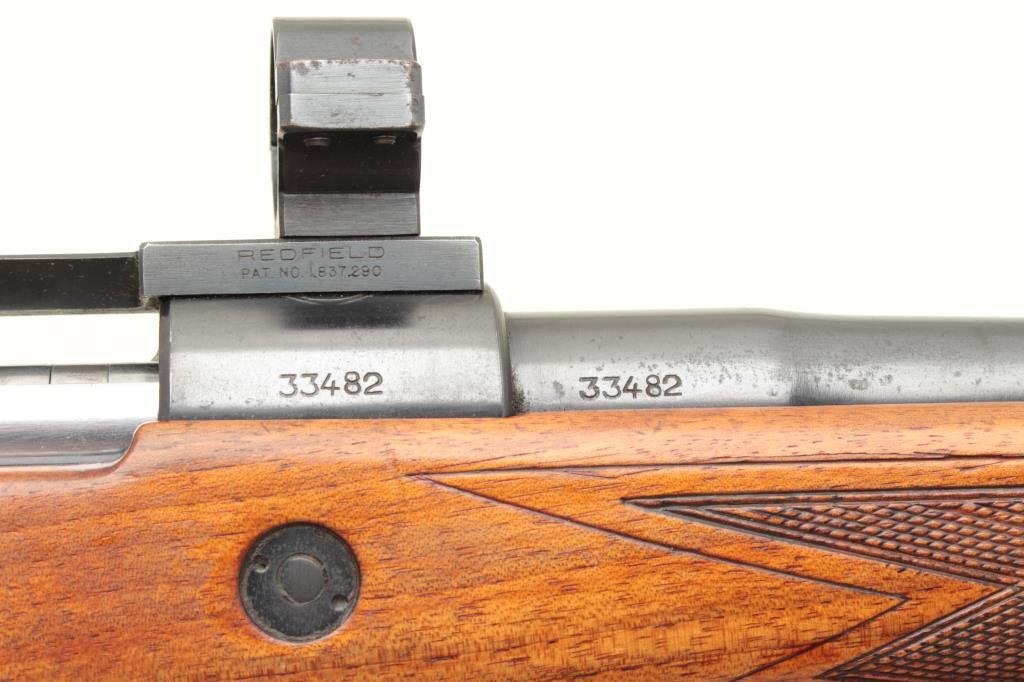 33482 with a 24” barrel and Redfield mount and rings in factory taps. Very good wood with minor use and slight imperfections. Thin line pad. Good action, excellent bore and the barrel is chrome steel. 1950’s to 60’s high quality workmanship. (C&R) Est.: $600-$1200