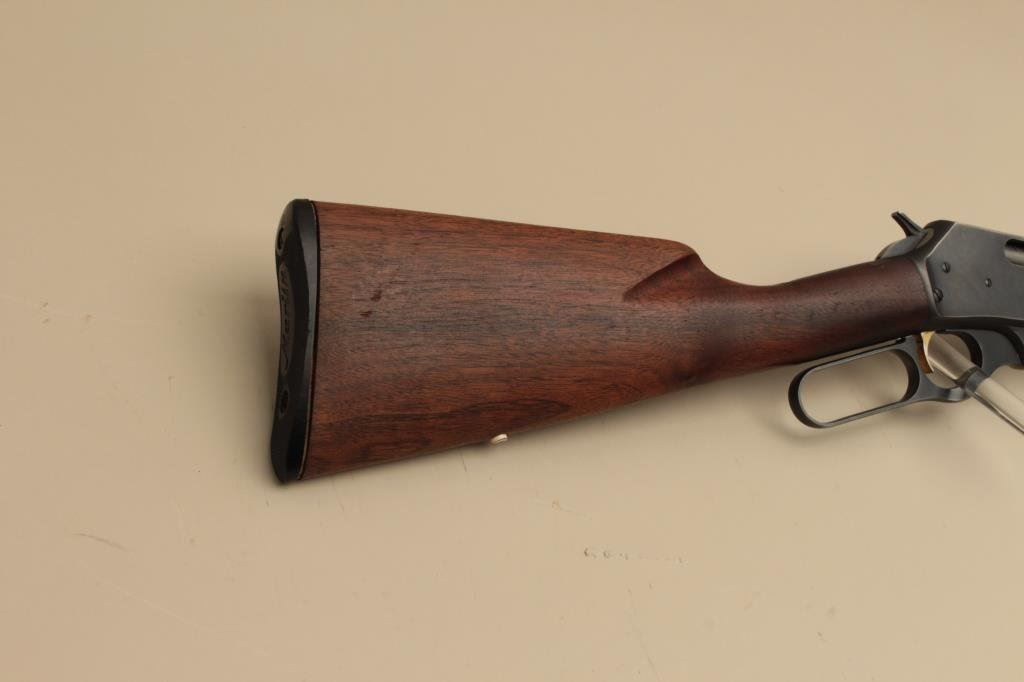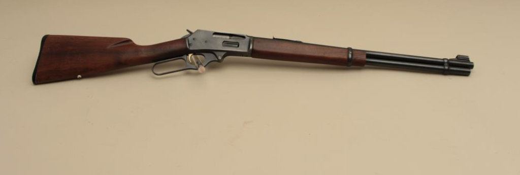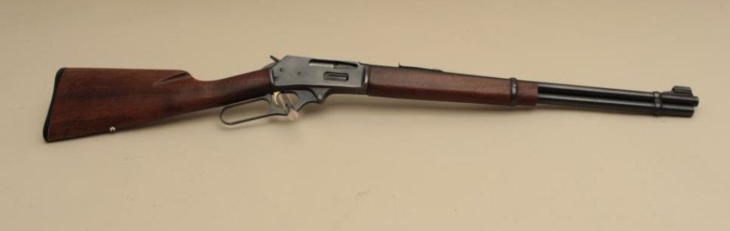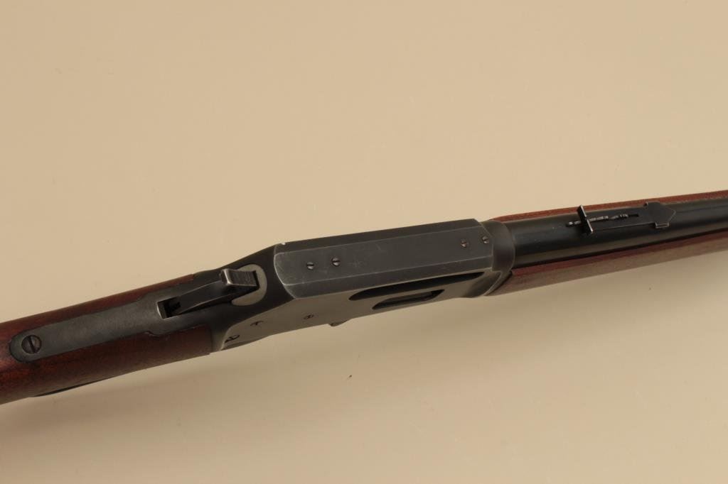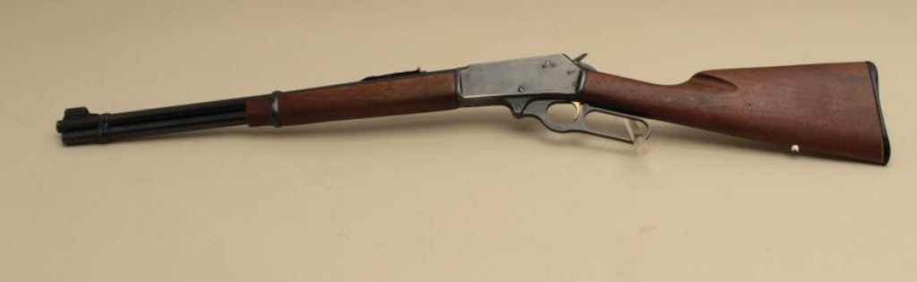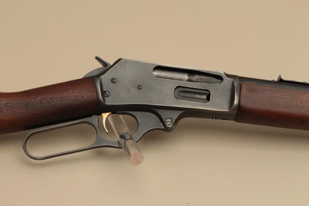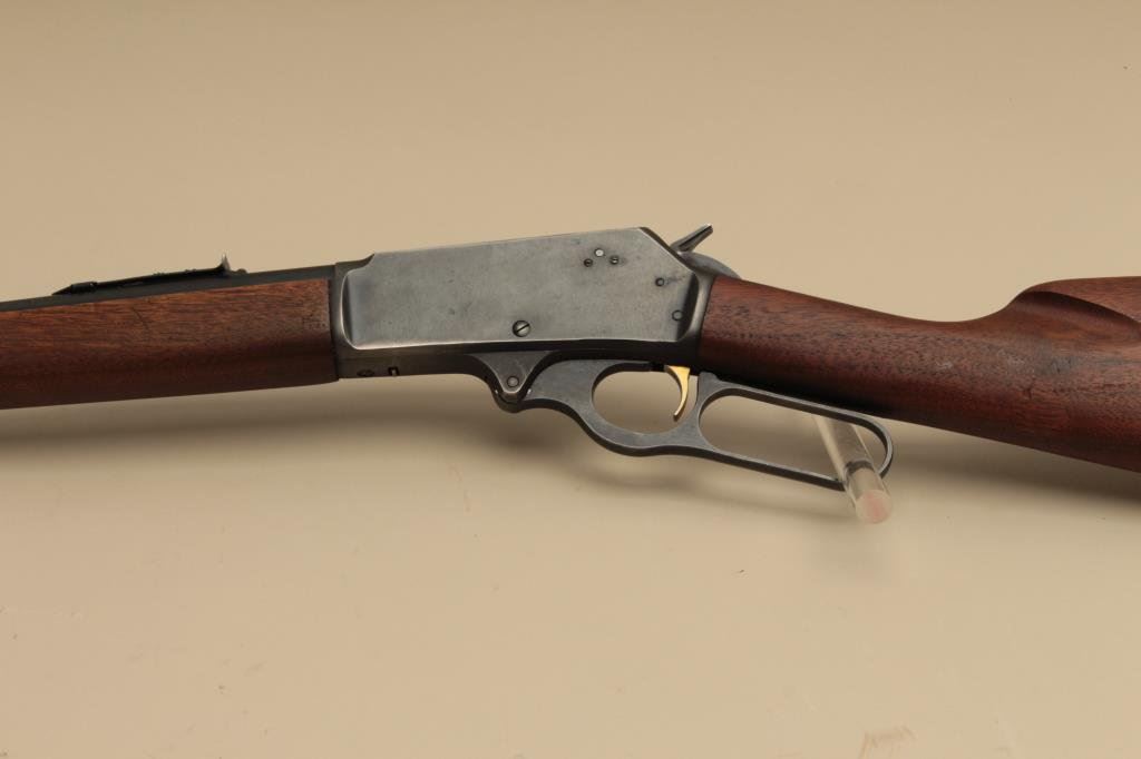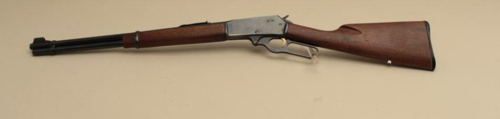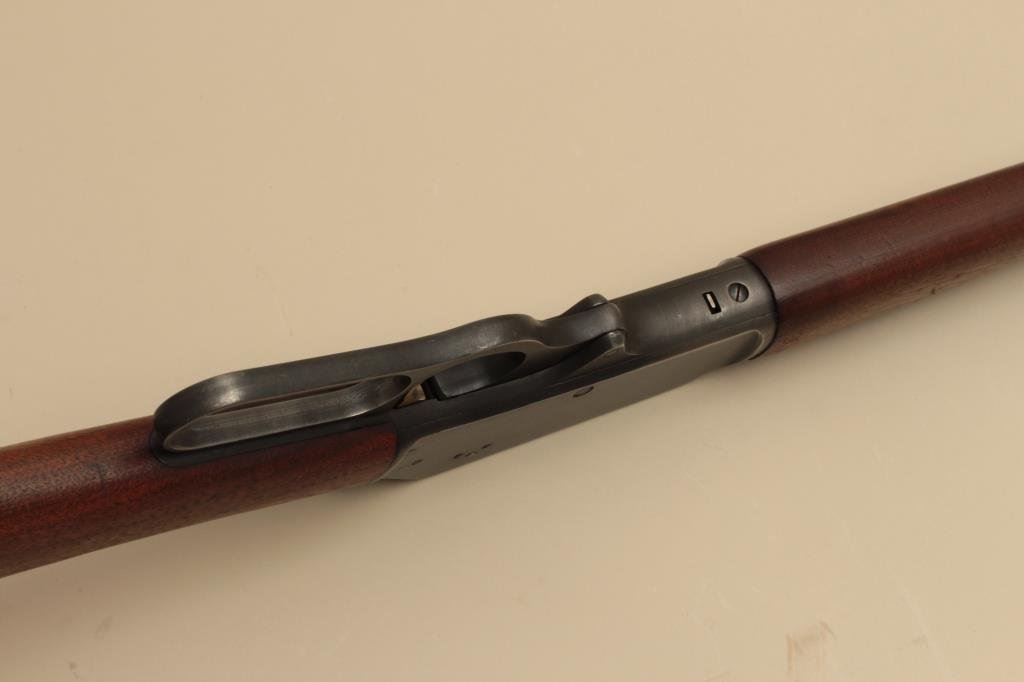 The rifle is in good overall condition with a 20” barrel. The barrel, full-length magazine and receiver retain the majority of their blue finish with light wear at the muzzle, surface erosion on top of the barrel and high point edge wear noted. The smooth wood stocks are in good condition with small mars and compressions. The butt stock has been shortened and a Marlin marked plastic butt plate added providing a 13 ¼” LOP. The bore is good, the action crisp and markings are sharp. (Modern). Est.: $250-$500.