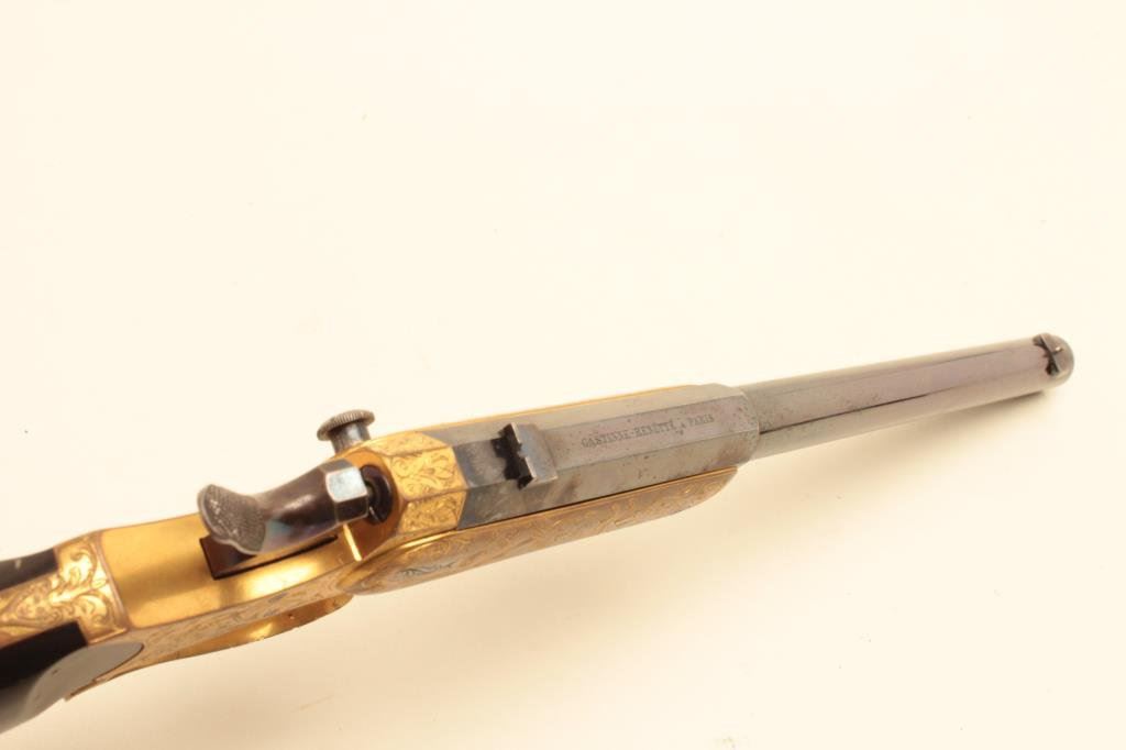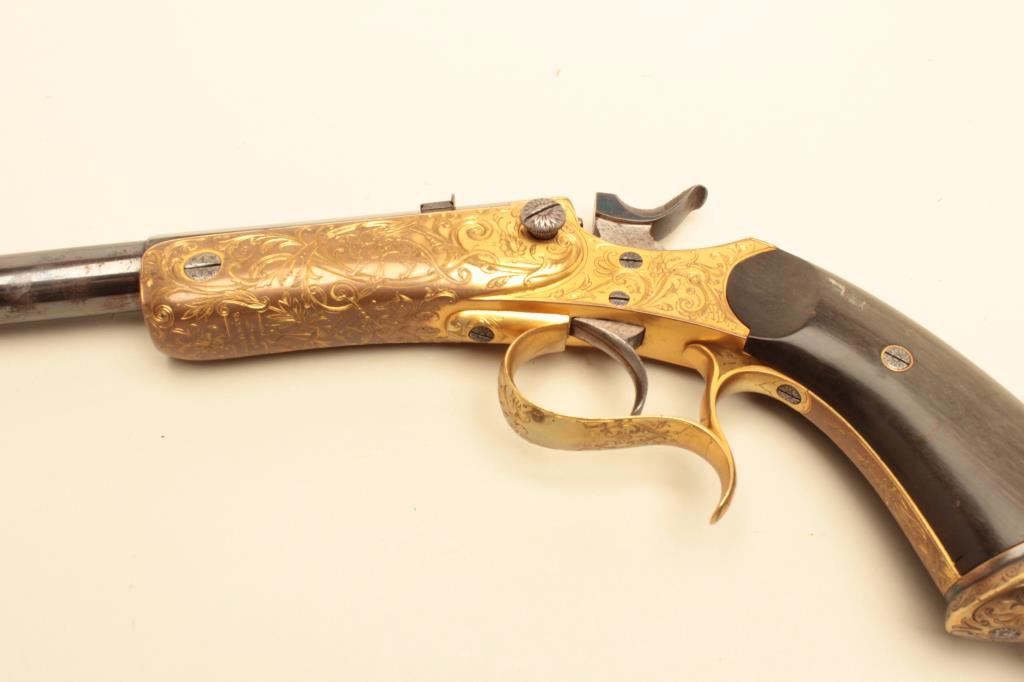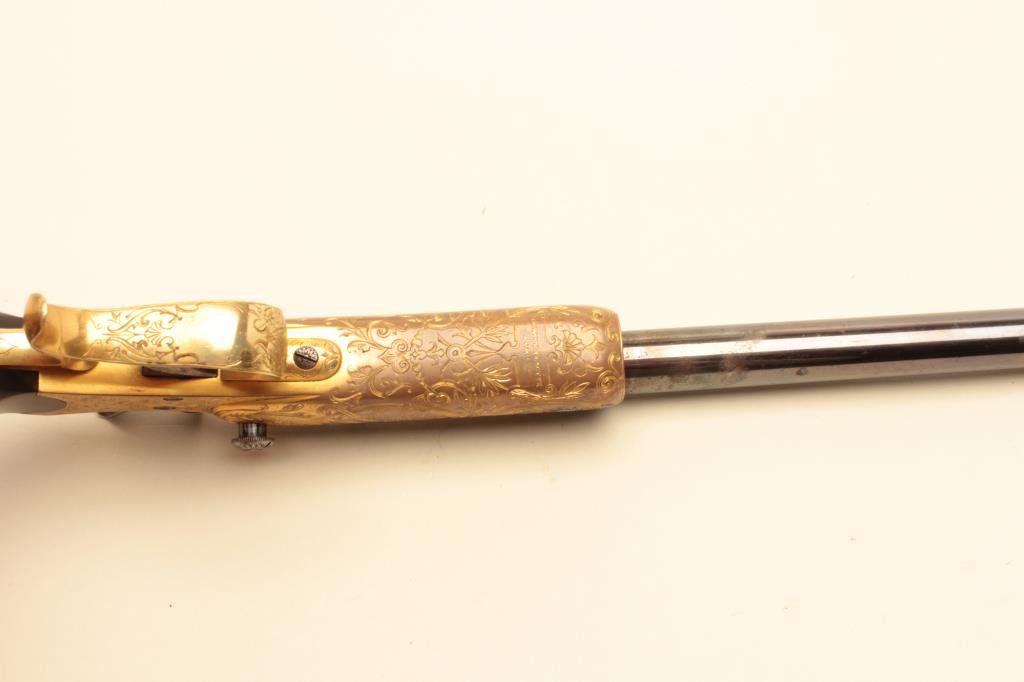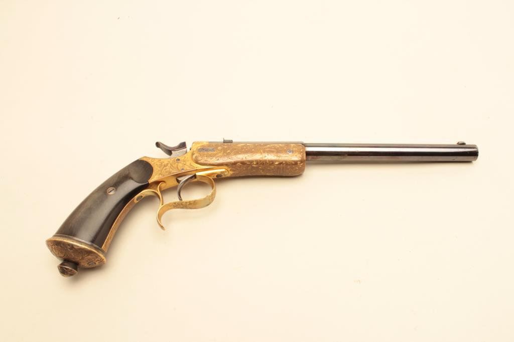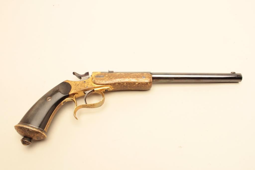 .22 caliber, 10” barrel, blued barrel, engraved and gold washed frame, trigger guard and butt cap, no visible S/N, overall near excellent condition with exhibition quality workmanship and engraving, crisp action, fine bore, horn grips; ca. 1880’s-1890’s; Gastine Renette of Paris was a maker to royalty. (Antique). Est.: $800-$1,600.