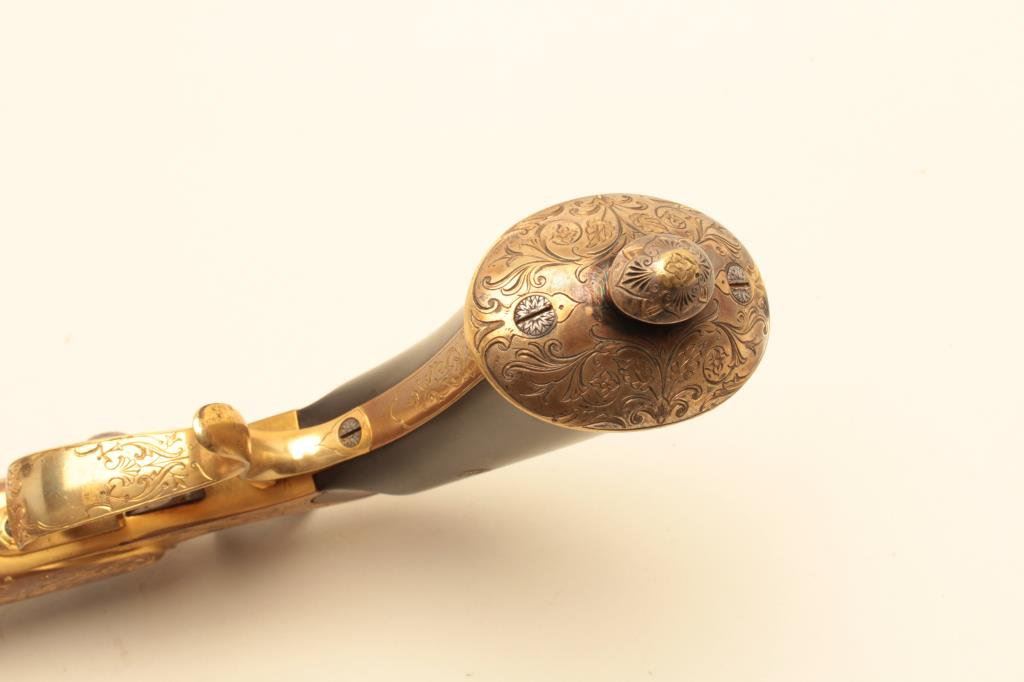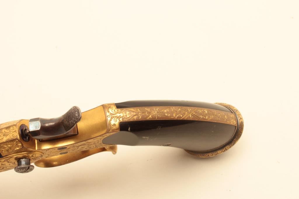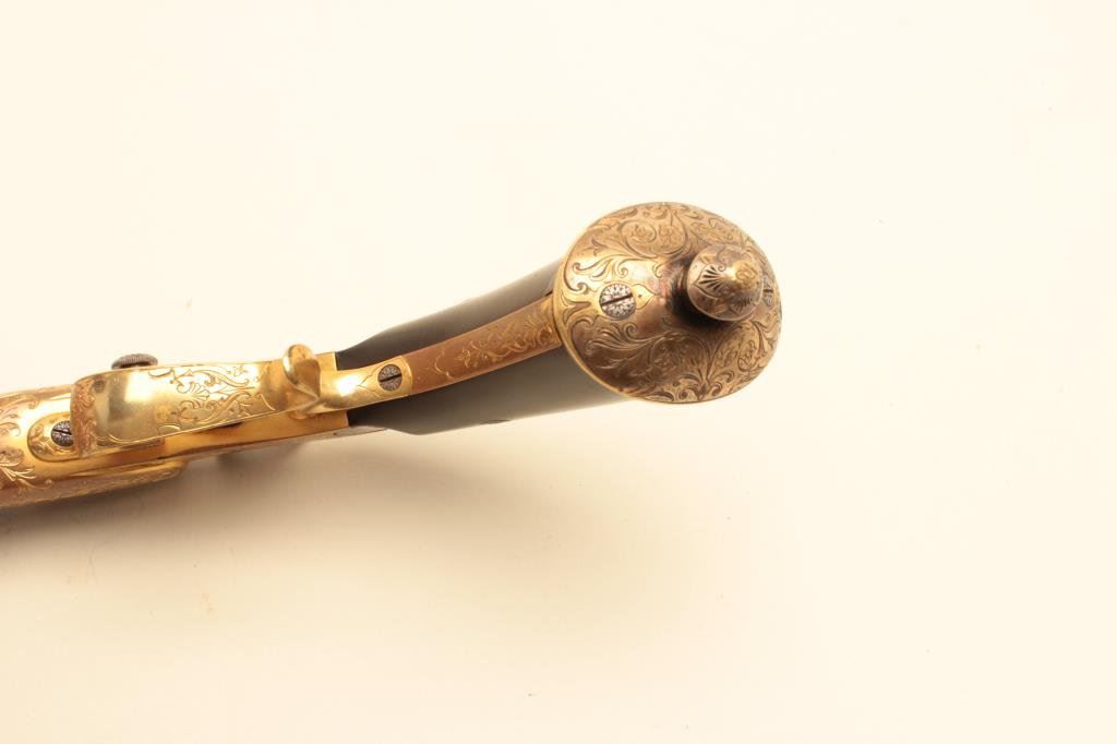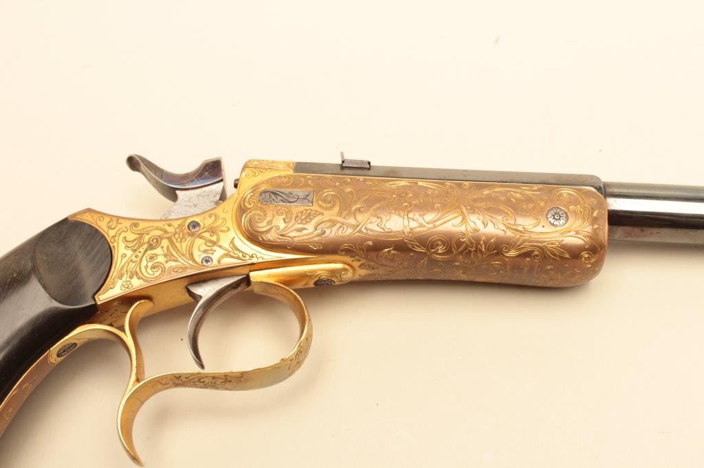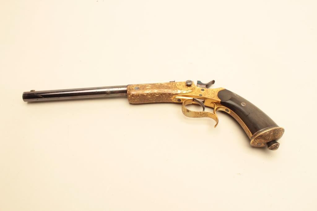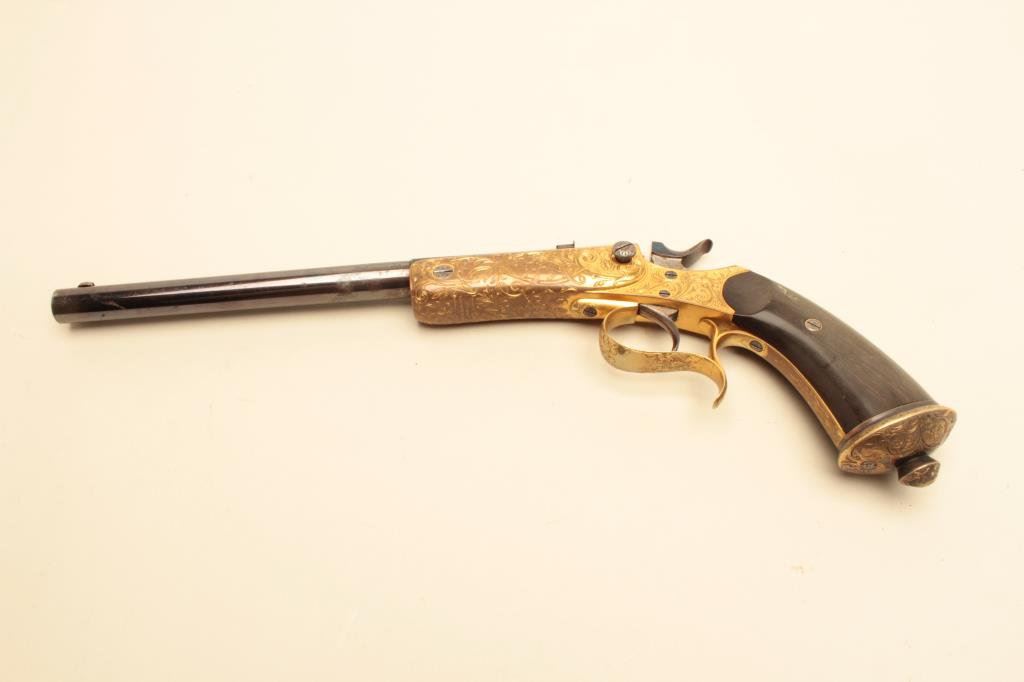 .22 caliber, 10” barrel, blued barrel, engraved and gold washed frame, trigger guard and butt cap, no visible S/N, overall near excellent condition with exhibition quality workmanship and engraving, crisp action, fine bore, horn grips; ca. 1880’s-1890’s; Gastine Renette of Paris was a maker to royalty. (Antique). Est.: $800-$1,600.