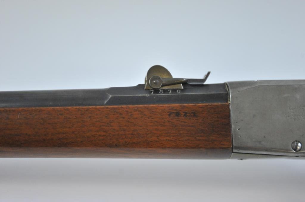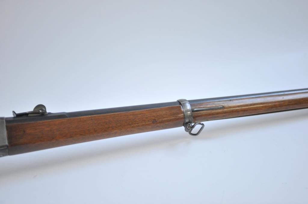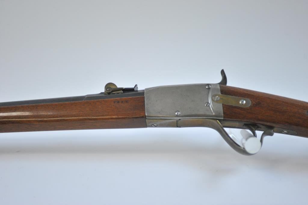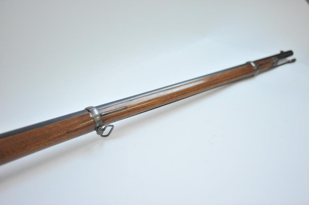 rifle in .41 Swiss Rimfire caliber, S/N 7870 showing 60%-80% original blue on the barrel; action polished lightly to bright metal and stock lightly re-finished with still visible proof and matching numbers. Very good plus overall. The action is good, the bore is bright and original cleaning rod is retained. A scarce Military collector’s rifle. (Antique) Est.: $500-$1000