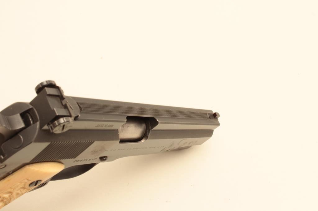 5” barrel, Giles custom rib and sights, carved grips, stippled front grip strap, action has been custom worked, blued finish, S/N 284054-C, in overall very good to near fine condition with majority of blued finish remaining showing several spots of erosion to the front end of the slide and frame, near fine bore, crisp action, sharp markings and finely carved custom grips. (Modern/PPT). Est.: $900-$1,800.