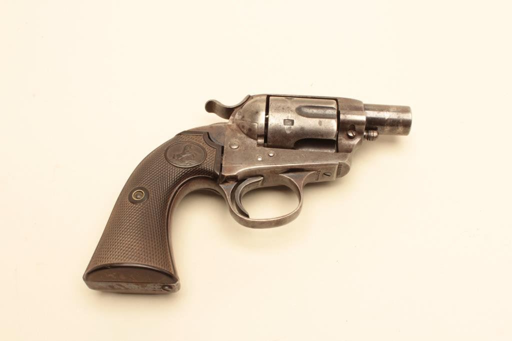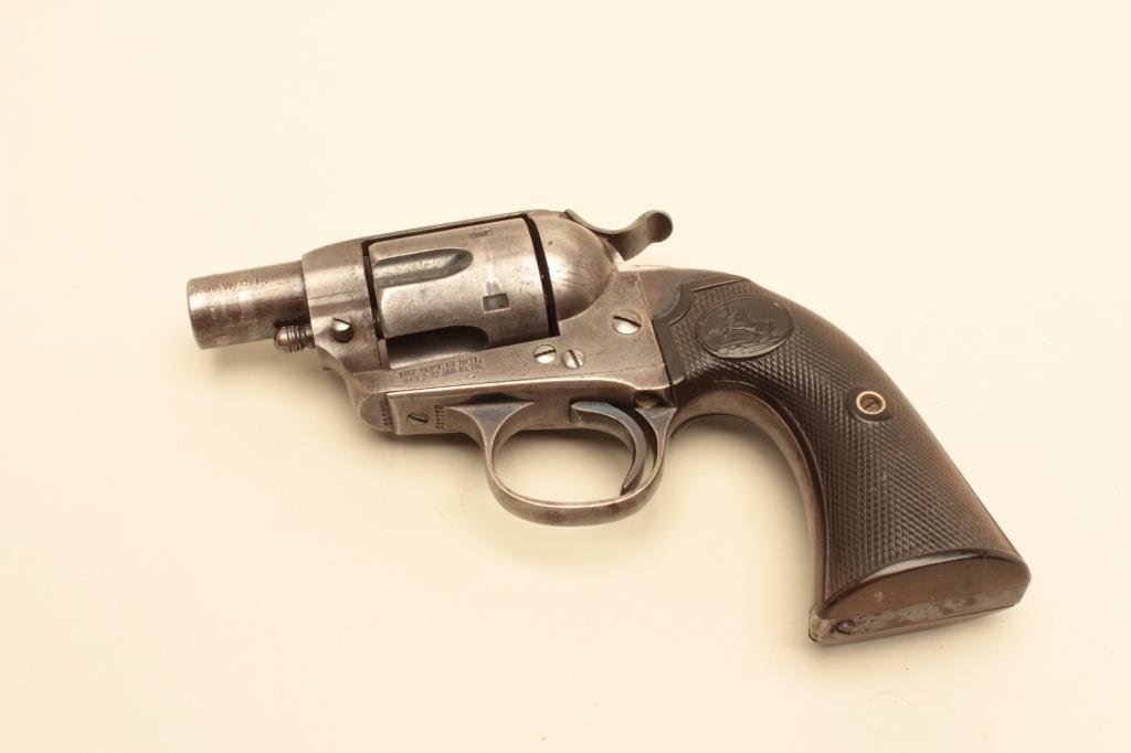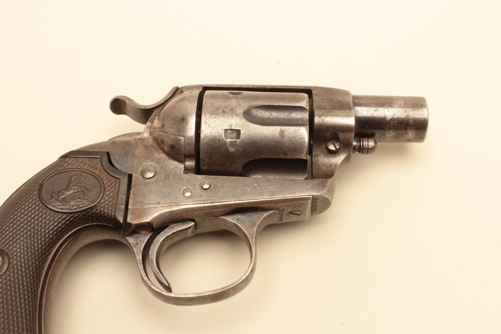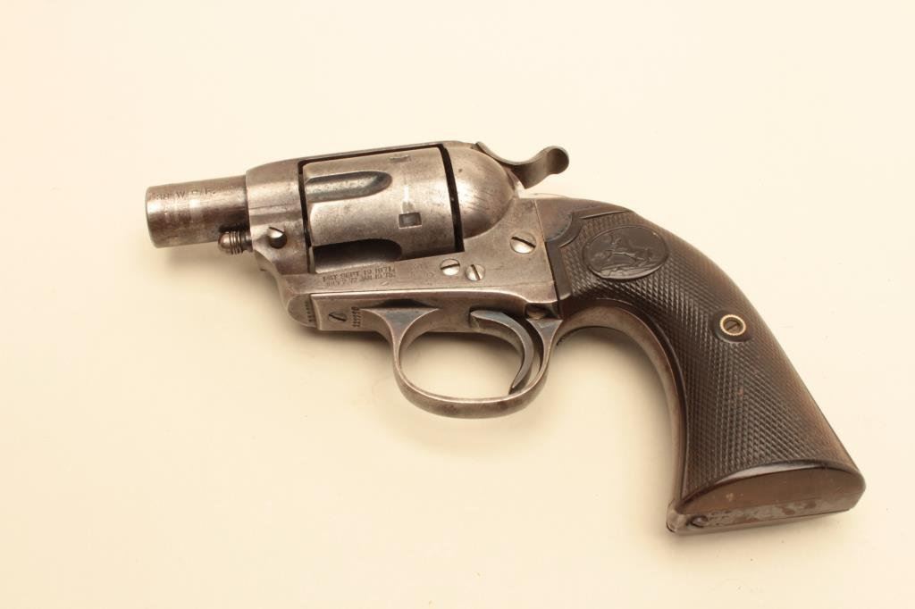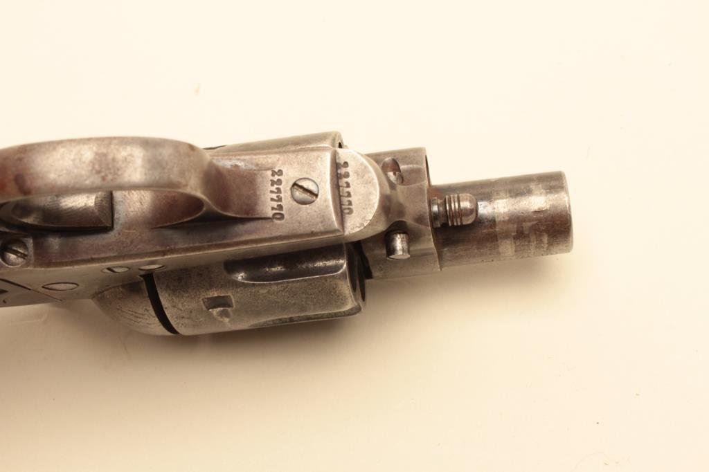 the barrel cut to a 2” for use as a “belly Gun”, S/N 22770. Made about 1902 during territorial era. 20%-40% original blue and case colors drifting to patina with some bright areas where protected. Good markings and good grips. All matching. Crsip action and good interior. Makes sense as a point and shoot belly gun that feels great in hand due to Bisley grip. A belly cannon in this Winchester rifle caliber! The era of train robbers in the west where this was collected. (C&R/No PPT) Est.: $600-$1200