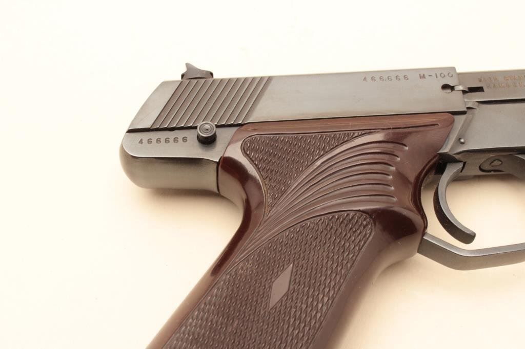 finish, checkered brown grips, S/N 466666, in like new condition with factory two piece blue and yellow cardboard box. (Modern/PPT). Est.: $300-$600.