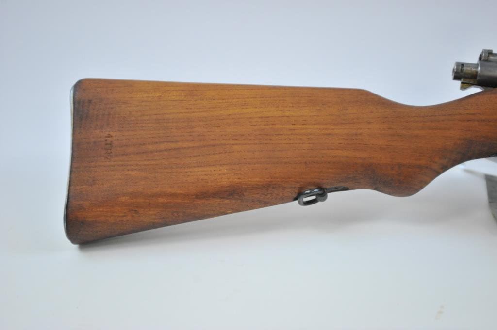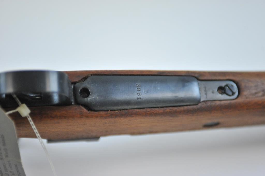 SABO II-44 on the left, S/N 3881 with matching bolt. Almost fine condition. 98%-99% blue original arsenal bright on the bolt. Fuzzy and light colored stock with no oiling or handling. Matching visible numbers. Bright bore. (C&R) Est.: $250-$500