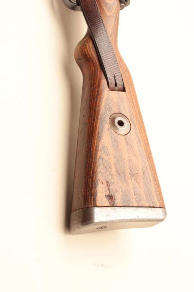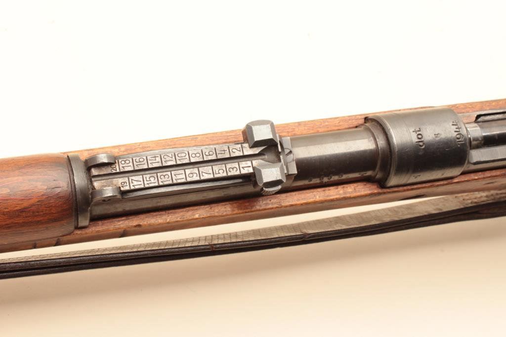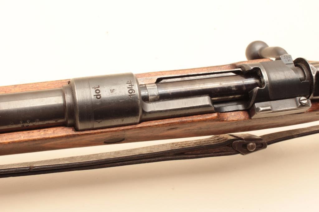 breech code “DOT” and 1944 date, S/N 8336. Matching bolt and Nazi proofs. Floor plate matches, and fore end cap #3777. Clean metal with 80%-90% original blue. Good bore and clean interior. No import marks. The stock is very good but no visible inspections with some marks and dings. Correct sling. Better than average. (C&R) Est.: $400-$800