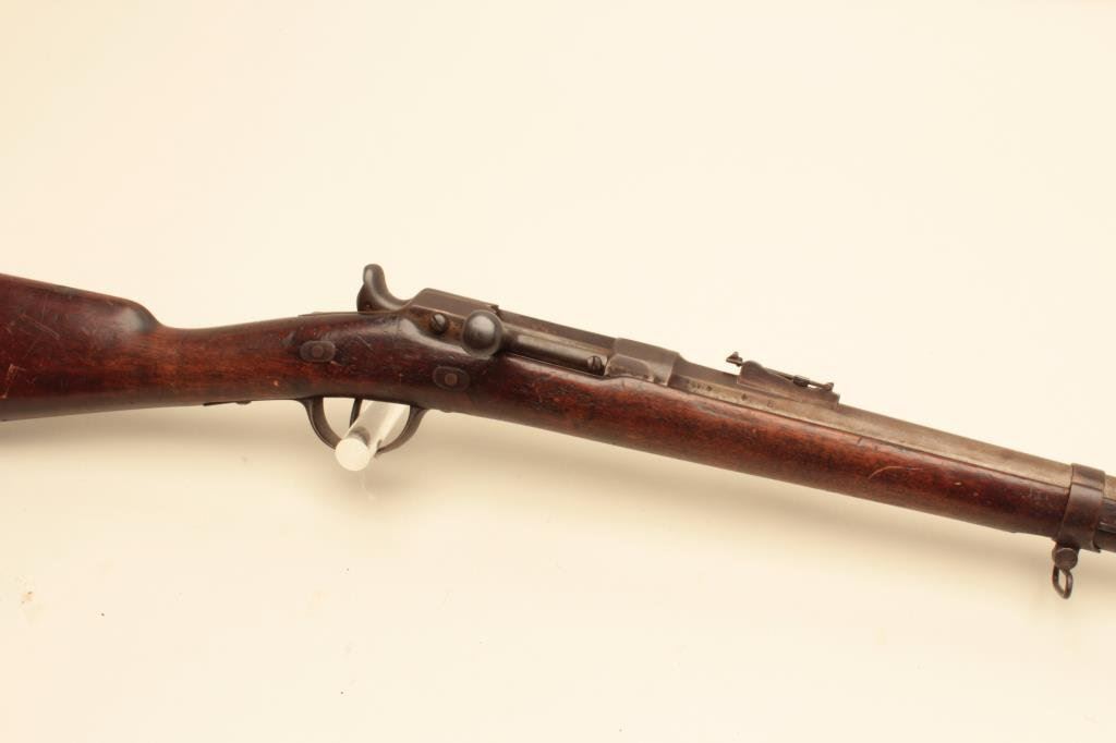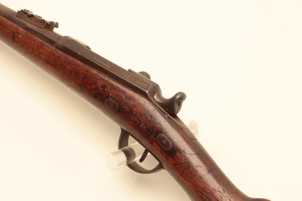 missing ramrod, full length wood stock; S/N U57717, overall fair to good condition with dark patina to metal surfaces, strong rifling in bore, crisp action, wood shows scattered old mars, dings and scratches from carry and storage. (Antique). Est.: $200-$400.