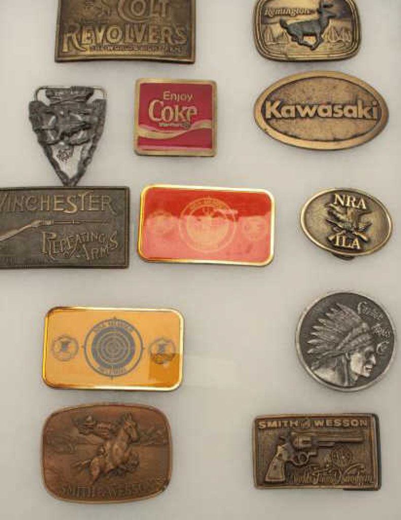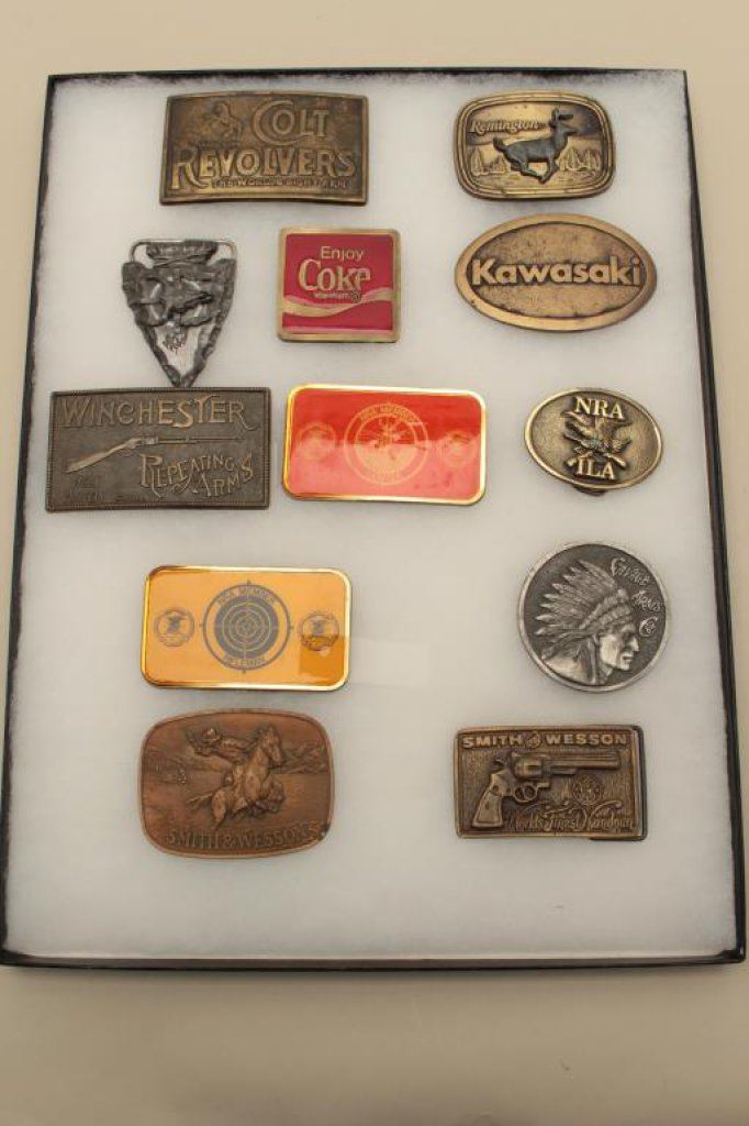 Lot 1011 Belt buckle collection in display case. Coke (Enameled), guns, and