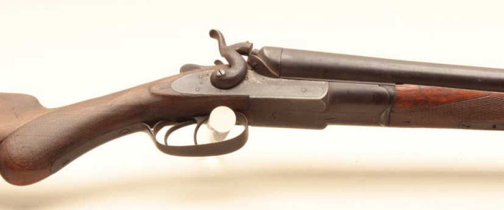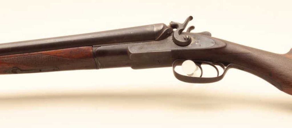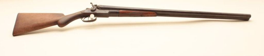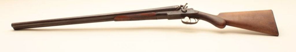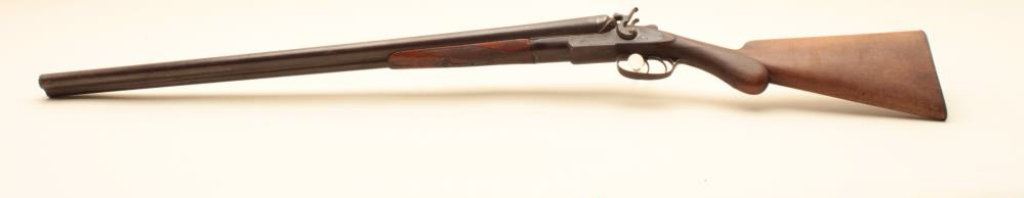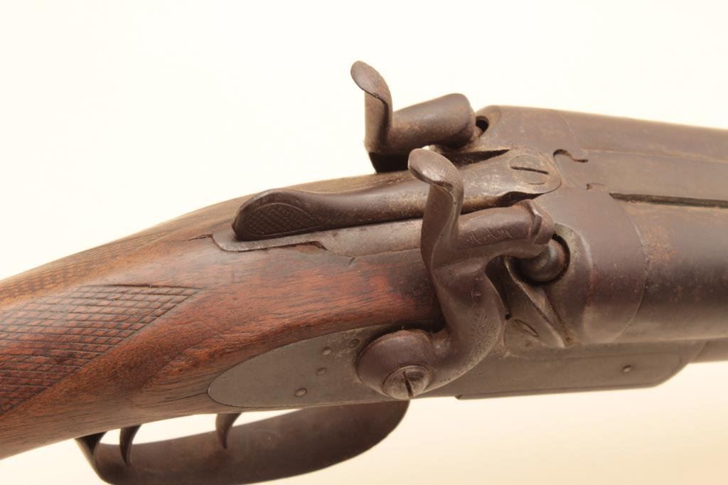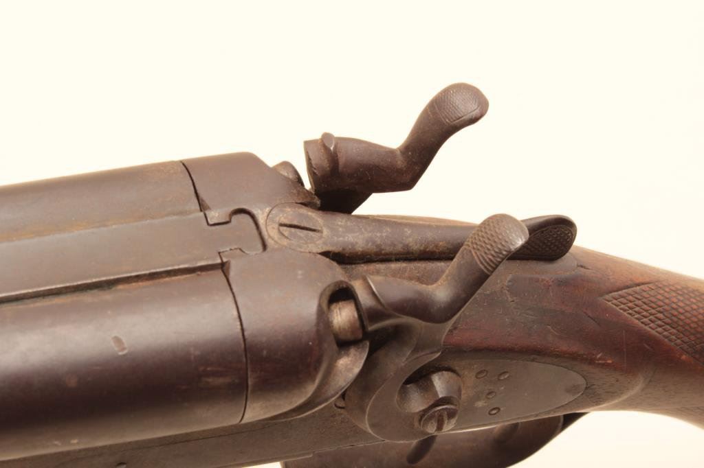 shotgun is in fair overall condition with 30” barrels. The metal surfaces have gone to a brown patina with some old toned case hardening still evident in the action side plates. There are several extra holes in the rib and the action does not appear to be tight on the face. The checkered wood stocks are in fair condition showing heavy use with mars and flattening of the checkering. The butt stock ends with a smooth, steel butt plate providing a 14” LOP. The bores are fair, the action functions and there are no visible markings. (Antique). $150-$300.