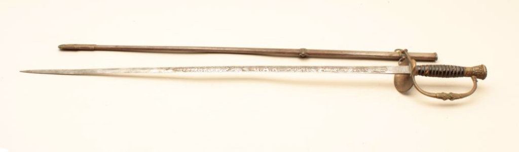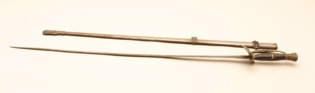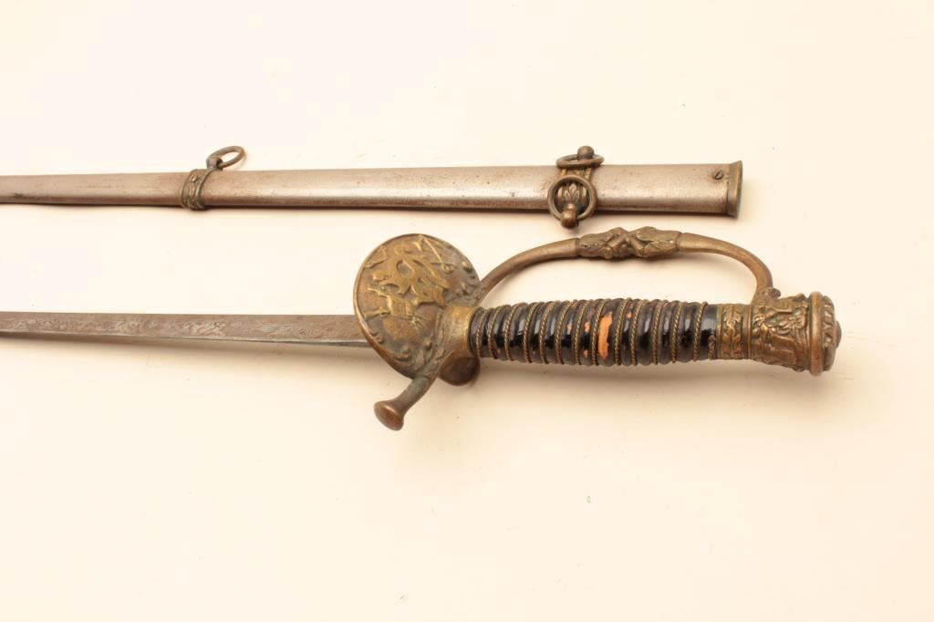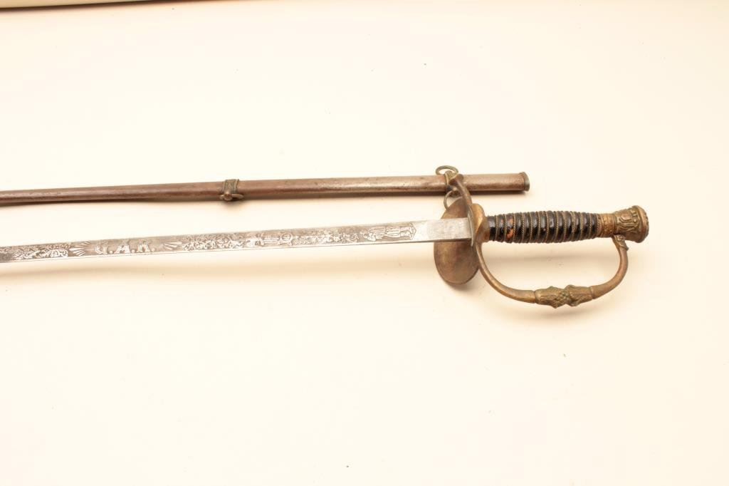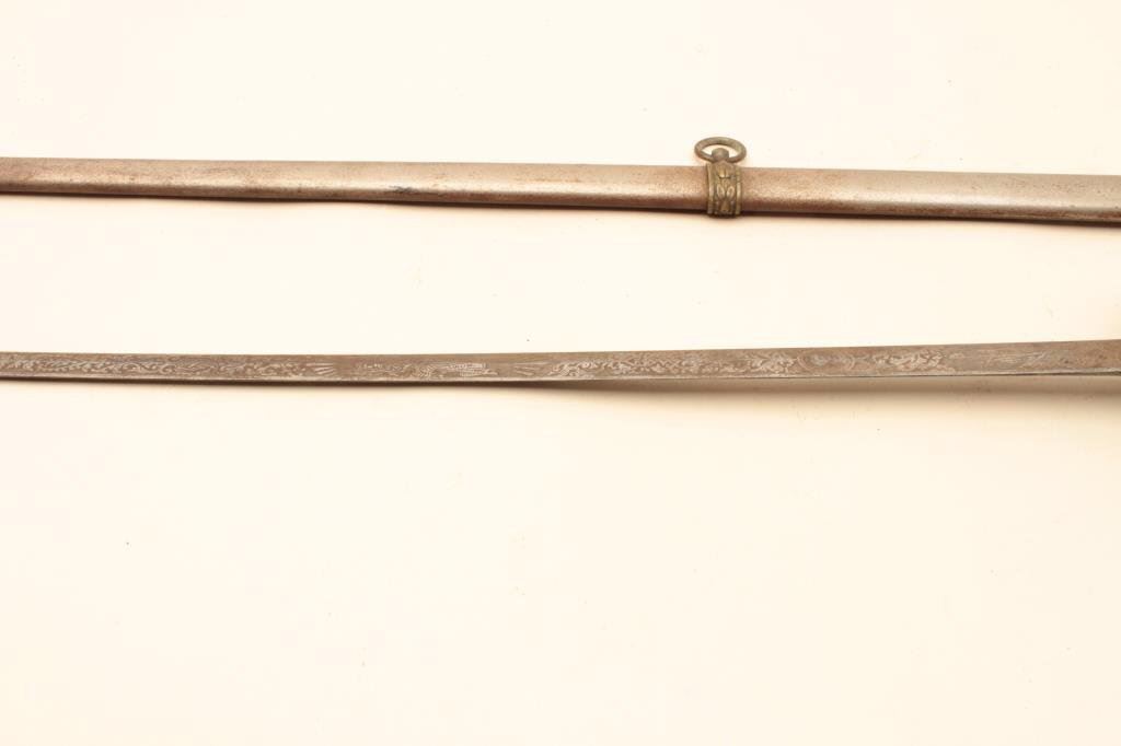 30” blade and an overall length of 35” in good condition. The blade is engraved and has G.A.R., the American eagle and a civil war era soldier saluting on one side and E. Pluribus Unum on the other. The blade has taken on a silver patina with light to moderate surface rust but does not appear to have been sharpened. The guard is brass and the handle is wire wrapped leather. The metal scabbard is a grey patina with light surface rust and a brass hangar. Est.: $25-$50.
