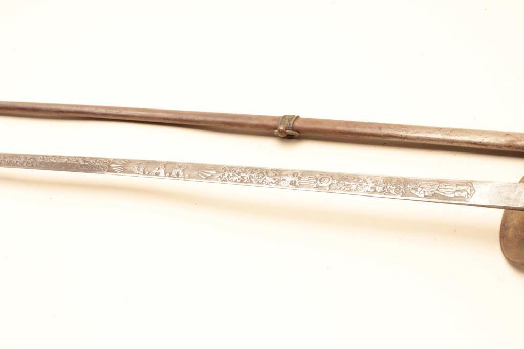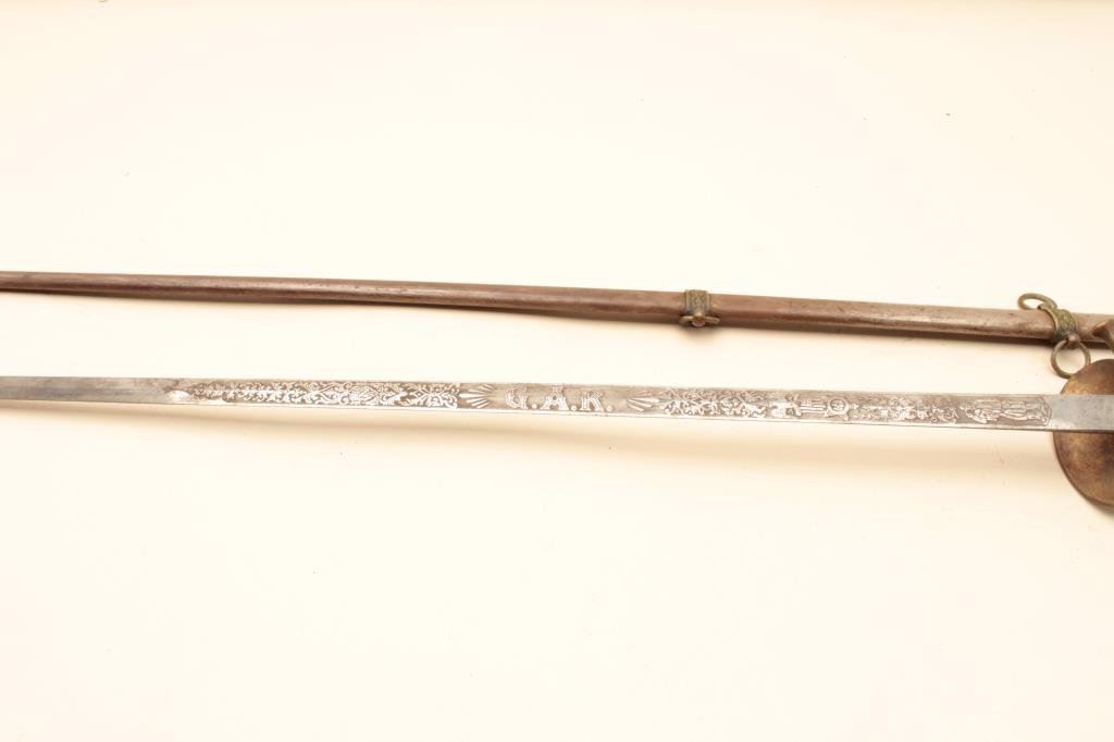 Lot 1050 GAR marked lodge sword with scabbard. The sword has a