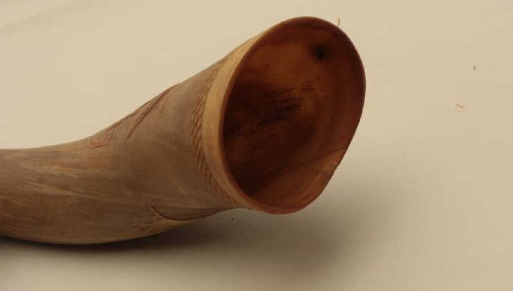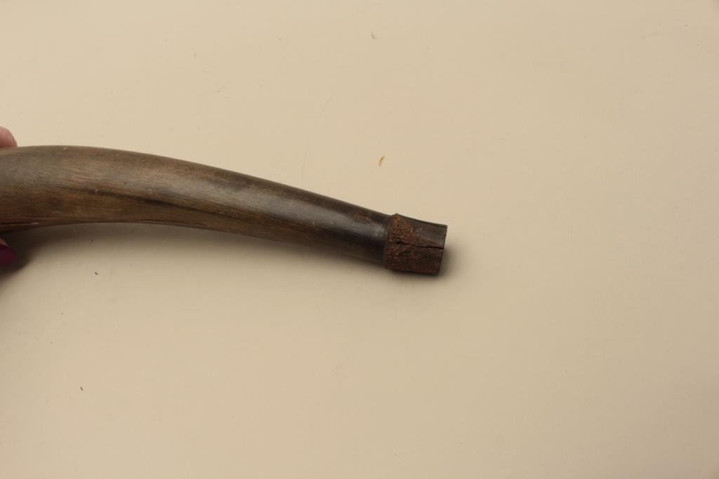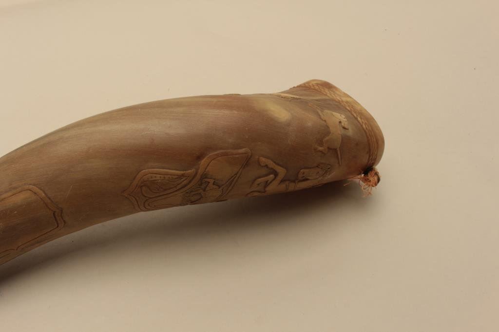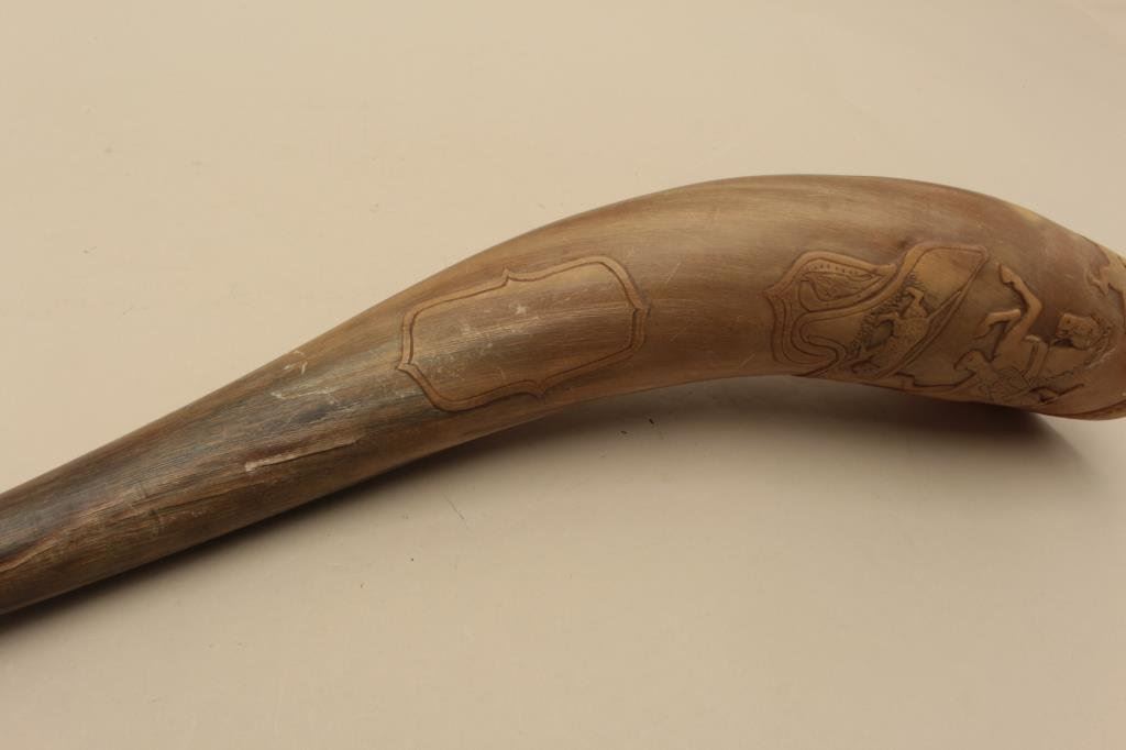 Lot 1068 Large vintage hunting horn with relief carving and display stand;