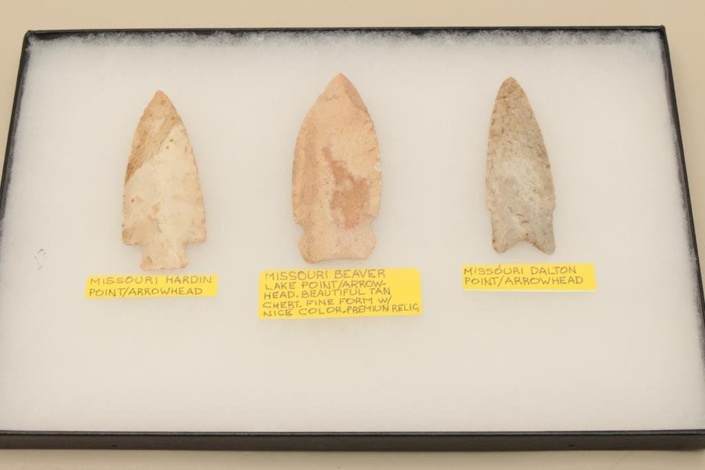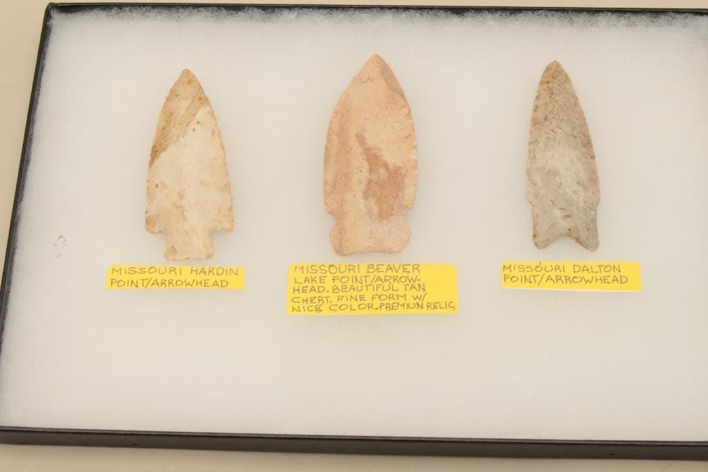 consignor, 1. “Missouri Hardin Point/Arrowhead”; 2. “Missouri Beaver Lake point/Arrowhead. Beautiful tan chert. Fine form with nice color. Premium relic” and 3. “Missouri Dalton Point/Arrowhead”. Est.: $650-$1,200.