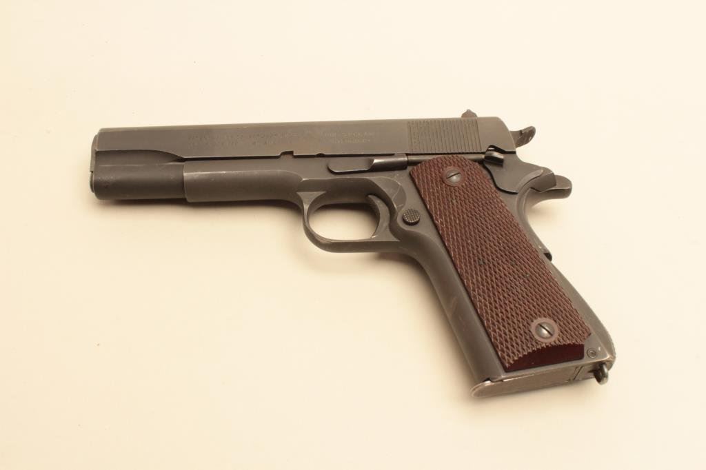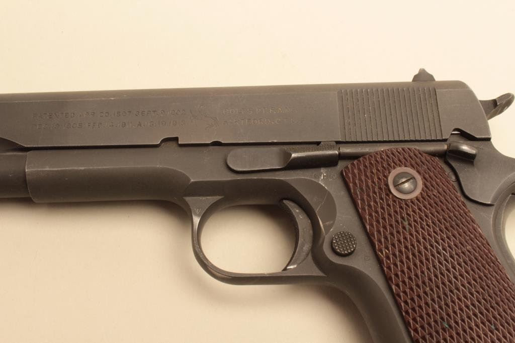 884707. This Colt shows 90%-95% arsenal finish with pronounced heat treat line on the slide. “G.H.D.” and “P” proofs. Near fine grips and sharp markings. Fine bore. “CR” marked military clip. A strong 9 for a WWII Colt. (C&R/PPT). Est.; $1200-$2400
