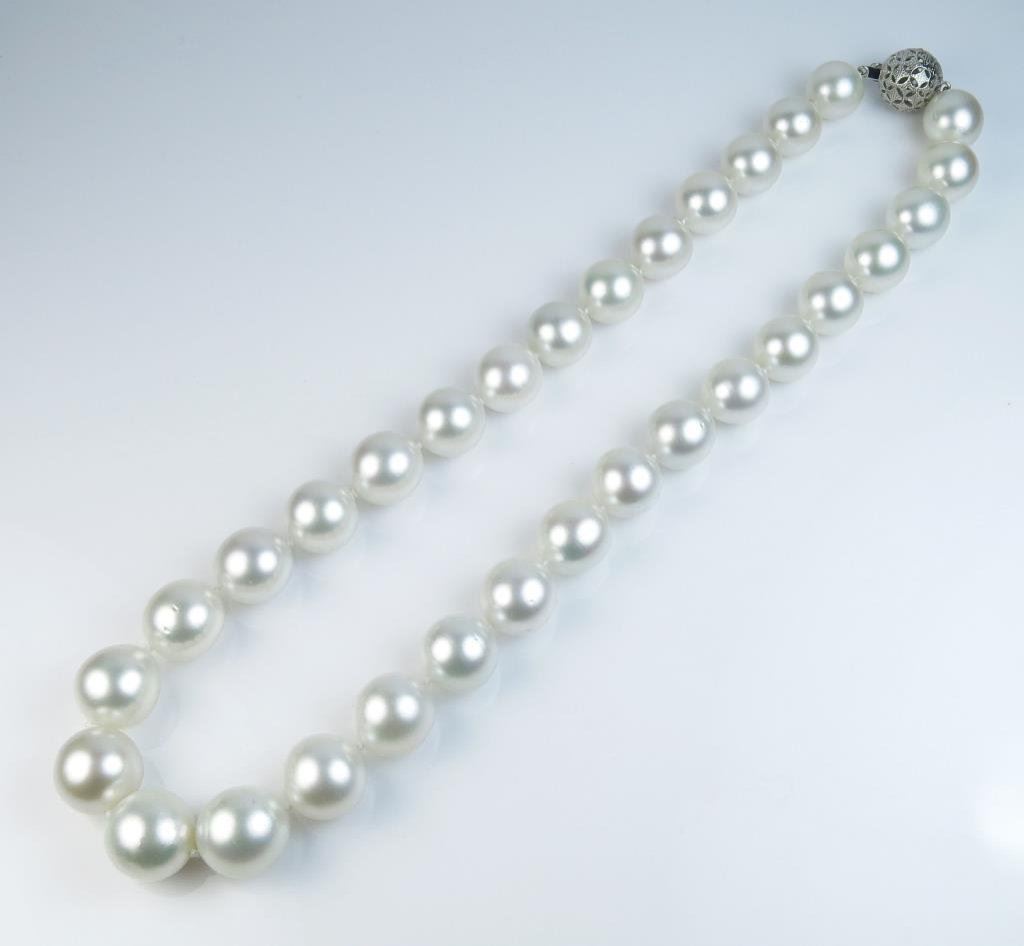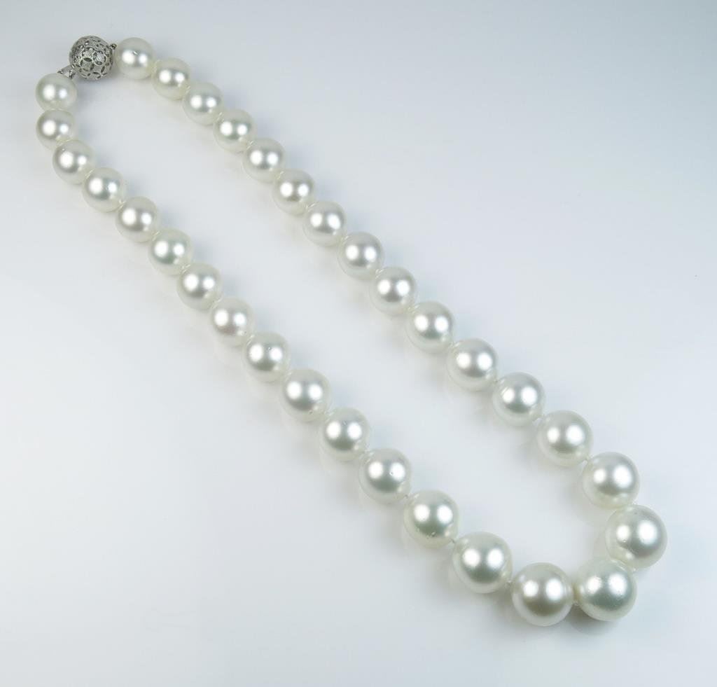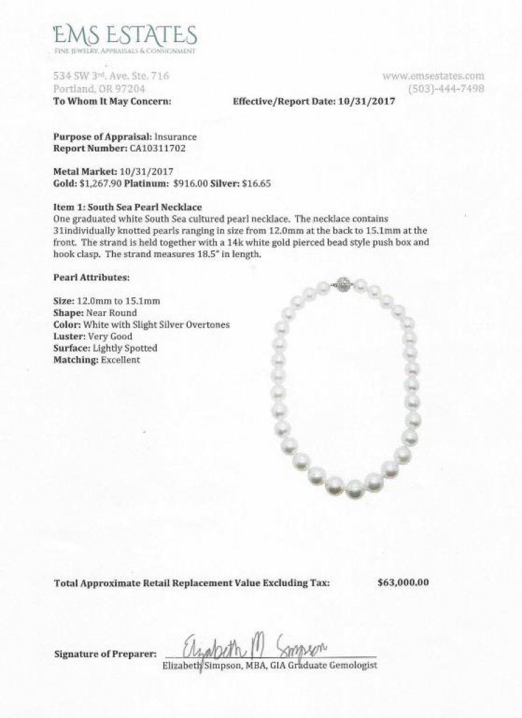 matching and very good luster ranging from 12.00MM to under 16.00MM in diameters with fine 14 karat white gold clasp. Full retail Appraisal at $63,000.00 Est:$10,000-15,000