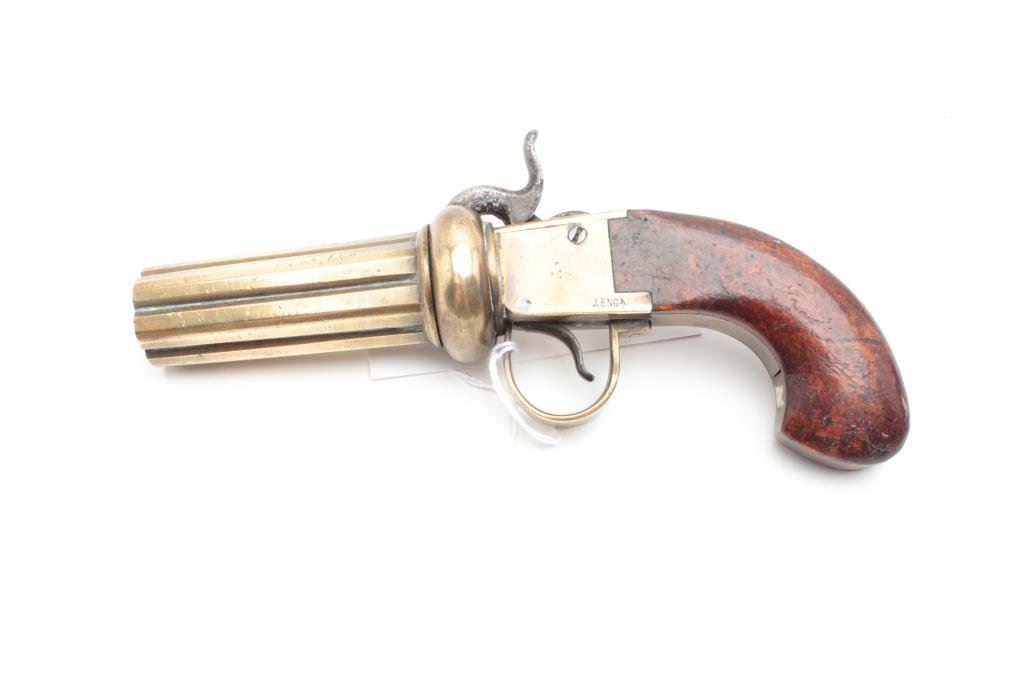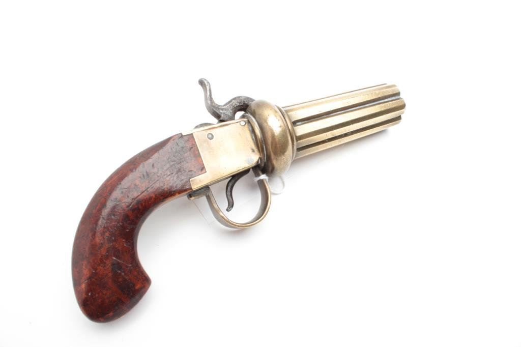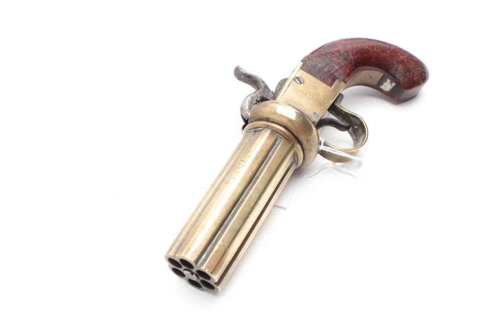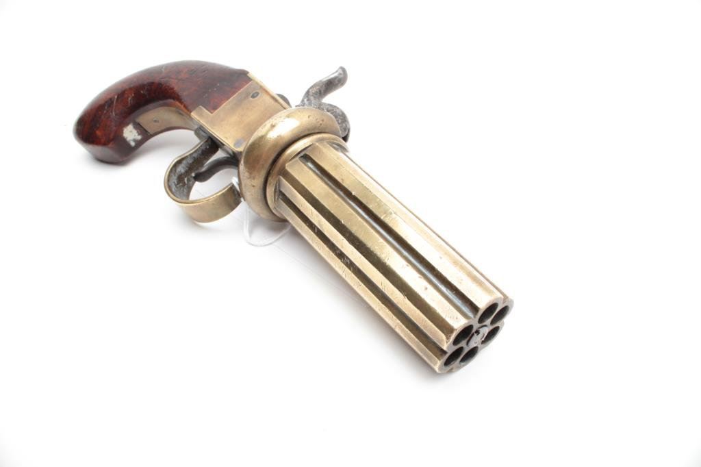 Lot 1163 Scarce 6 barrel all brass Darling type pepperbox. Most of