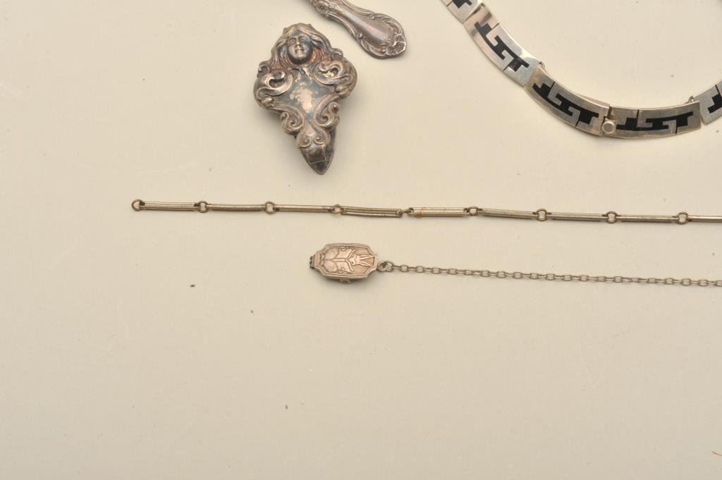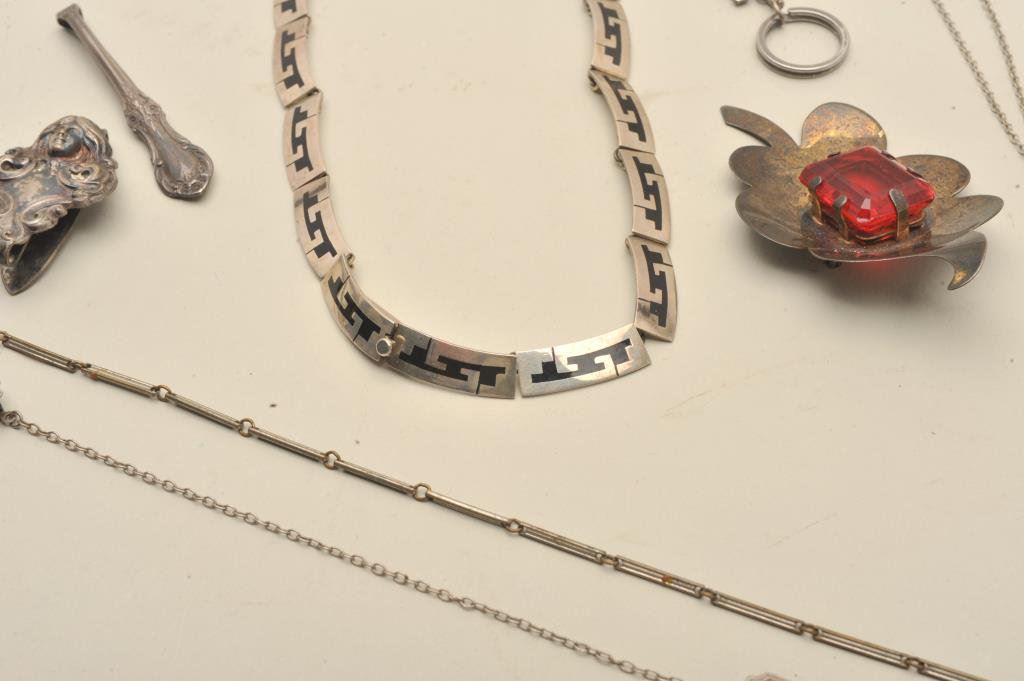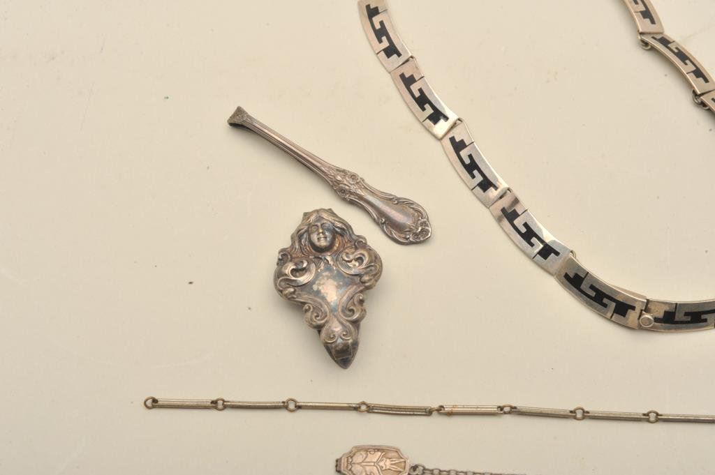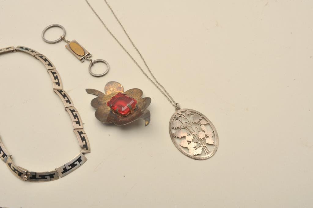in leaf design, old Taxco Mexican necklace with black enamel in 1940’s style, tie tac from baby spoon, key chain, chain with clips (bookmarks?), German silver marked roach clip from S.F. 1960’s. Estate consigned. Est.: $125-250