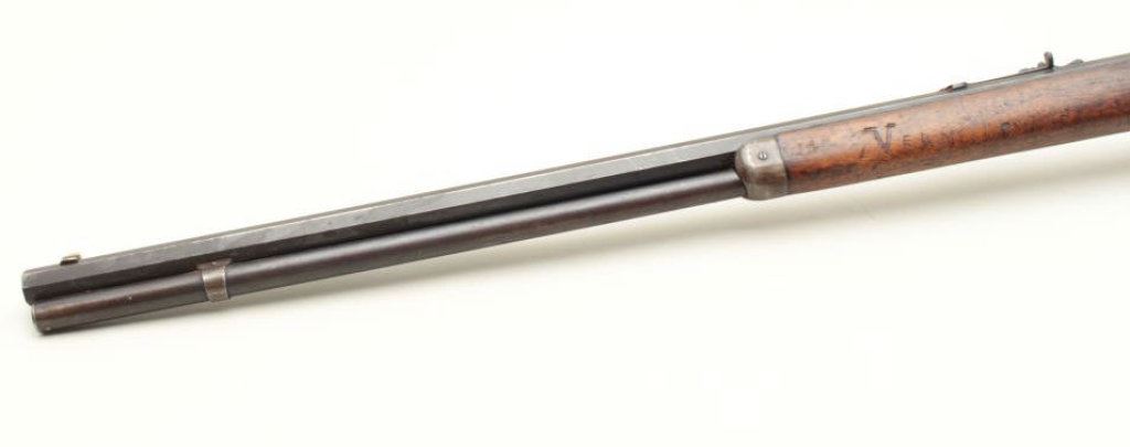 a 26” octagon barrel, full mag, and rifle butt, S/N 150284. Made at the turn of the 20th century. Good overall condition with 50%-60% blue showing minor erosion and pinprick pitting. Vern carved in the fore end and kill notches on the tang and wrsit for Vern’s game count? The stock is fair to good. Good markings and good action. The bore is also good. Found near Vista, CA in ranchers collection. (C&R) Est.: $300-$600