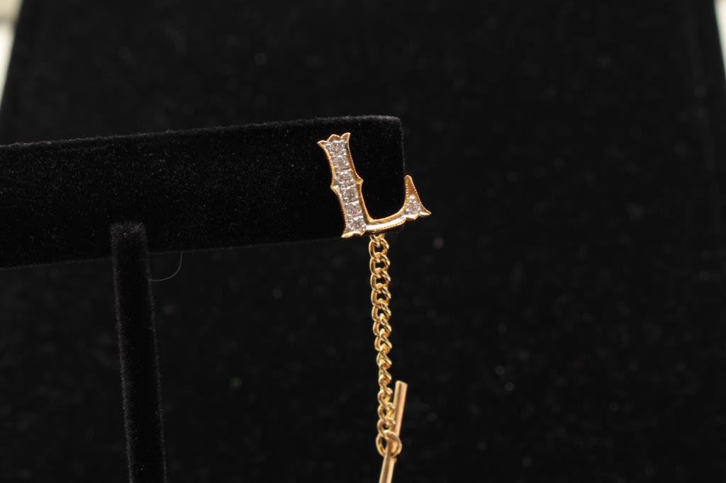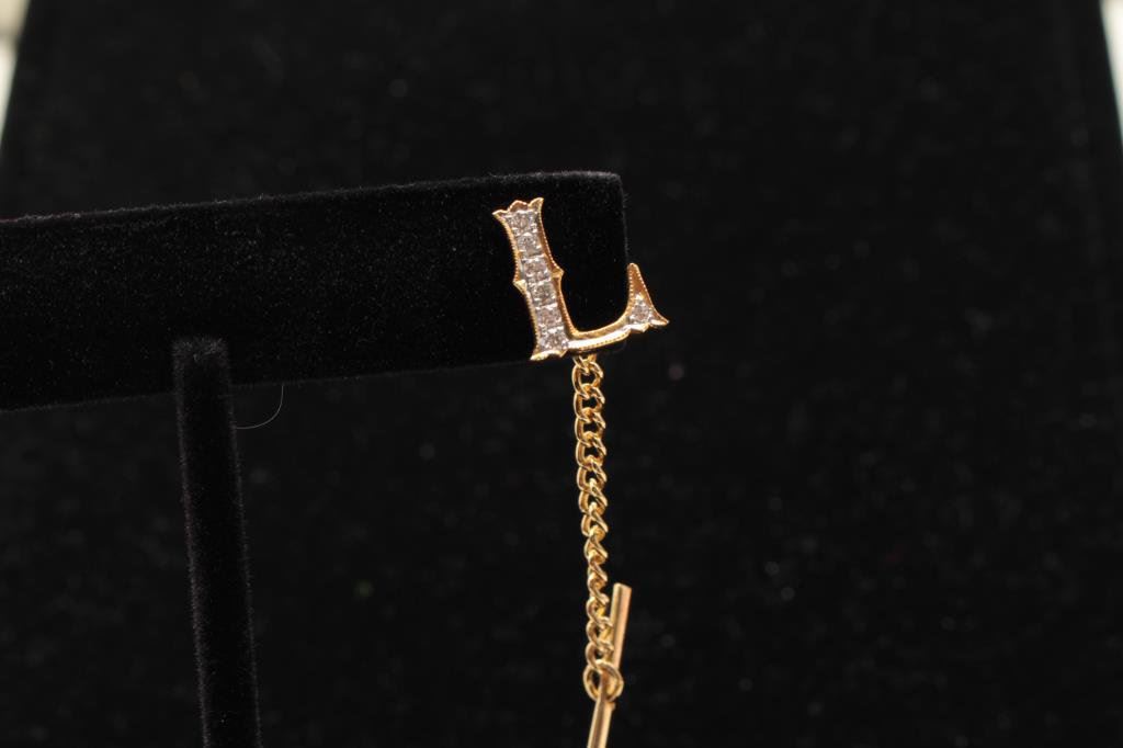 Lot 1188 14k (unmarked) L tie tack set with diamonds of Lee