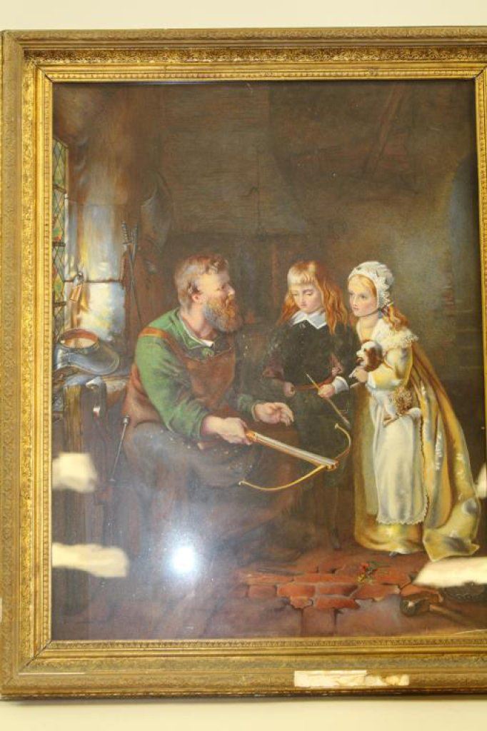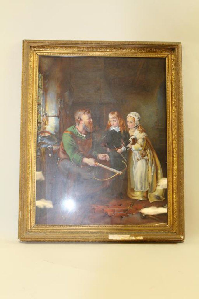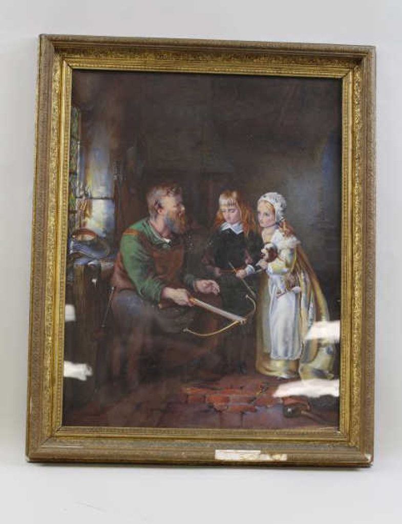 squire and young lady holding spaniel puppy. Measures 24” x 18 ½” in same vintage Victorian frame showing damage to gesso and gilt. Est.: $350-$700