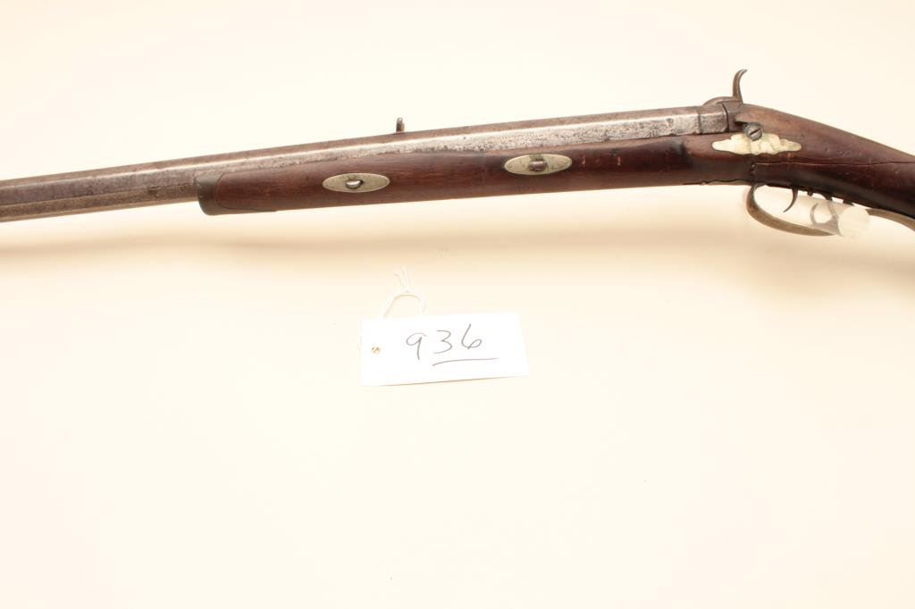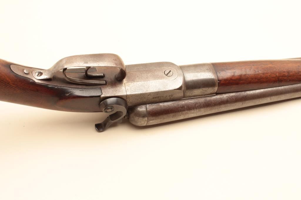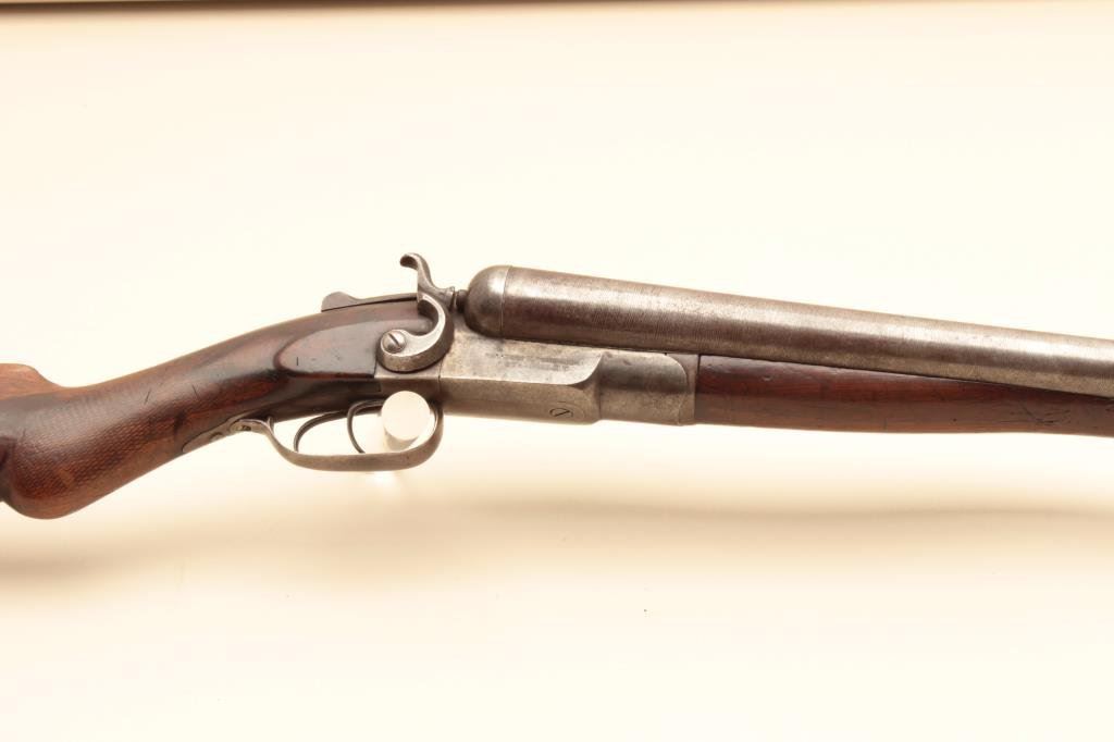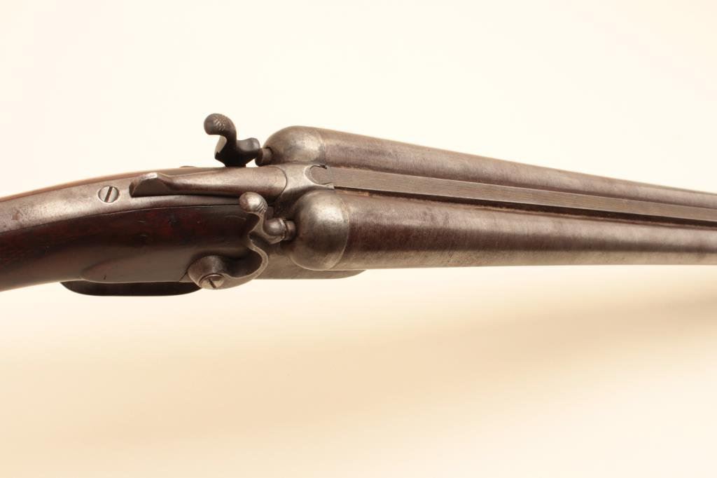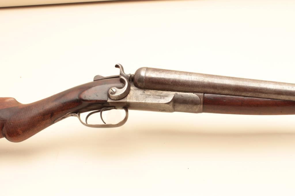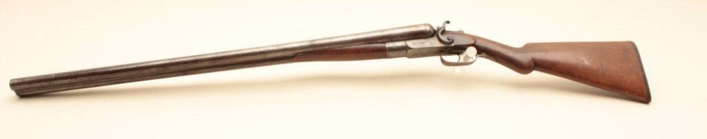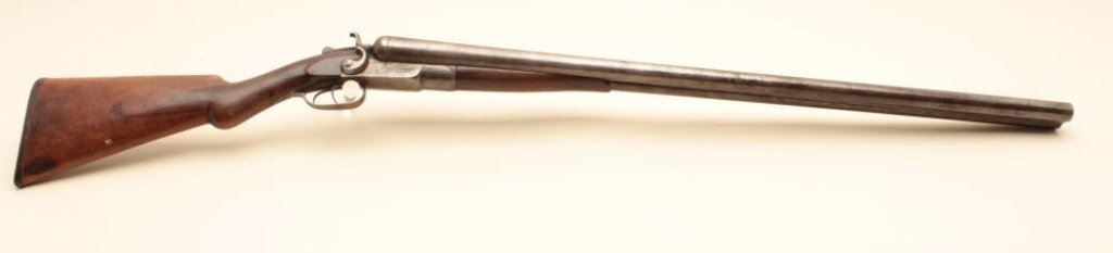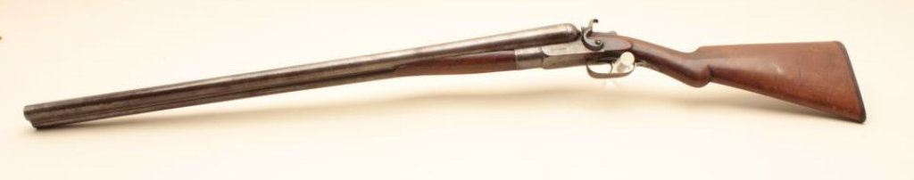 #NSNV. The shotgun is in fair overall condition with 32” Damascus barrels with a full-length filed rib and steel bead front sight. The metal surfaces have gone to a mottled grey patina with some old toned case hardening still evident in the action. The checkered wood stocks are in fair condition showing heavy use with mars and flattening of the checkering. The butt stock ends with a hard rubber butt plate providing a 14” LOP to the front trigger. The bores are fair, the action functions and the markings are sharp. (Antique). $300-$600.