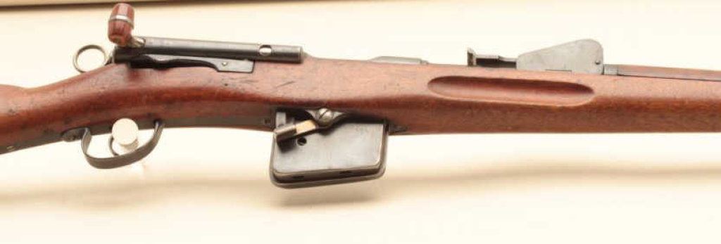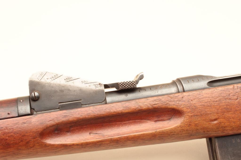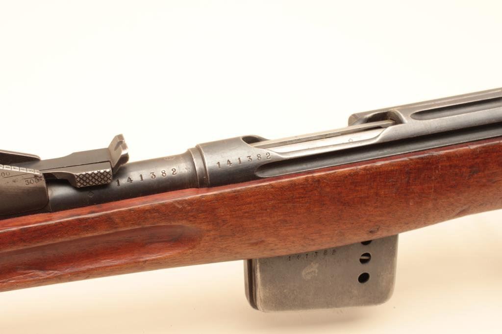 Serial #141382. The rifle is in good overall condition with a 30” barrel. The barrel and receiver retain the majority of the military finish with edge wear and handling marks. All visible serial numbers are matching and the Swiss cross markings are visible on the front ring and barrel. The smooth wood stocks show heavy use with dents and compressions consistent with service use. The butt stock has numerous cartouches noted and ends with a smooth, steel butt plate. (Antique). Est.: $350-$700.