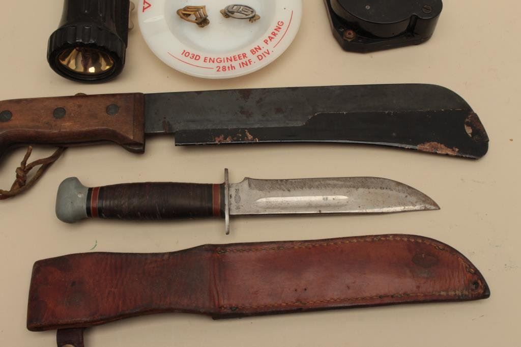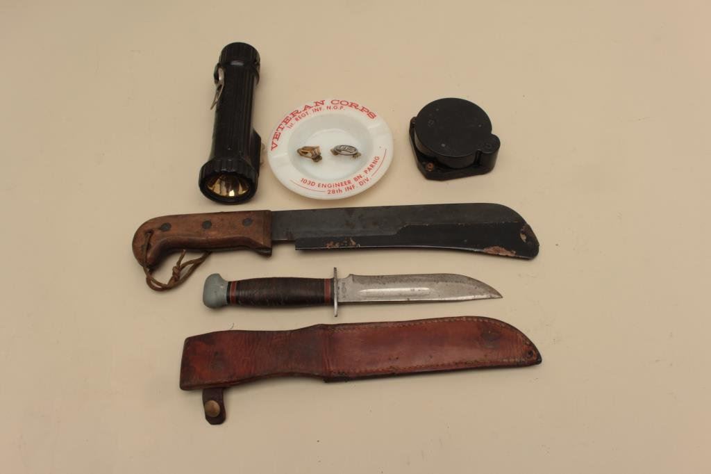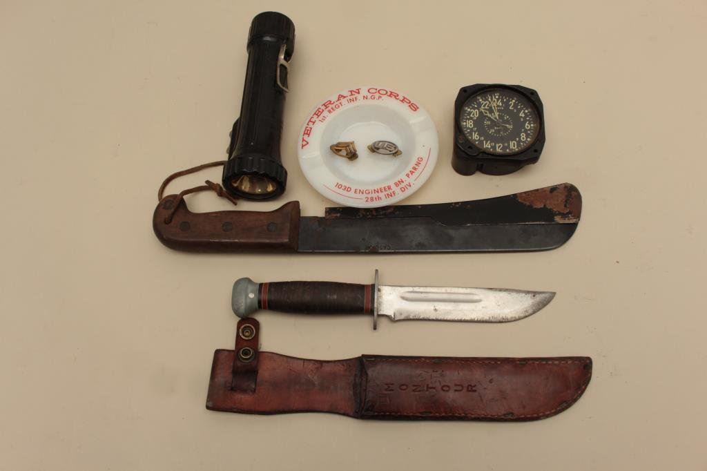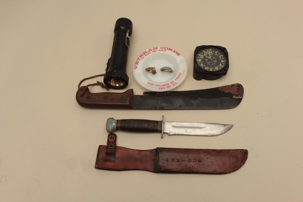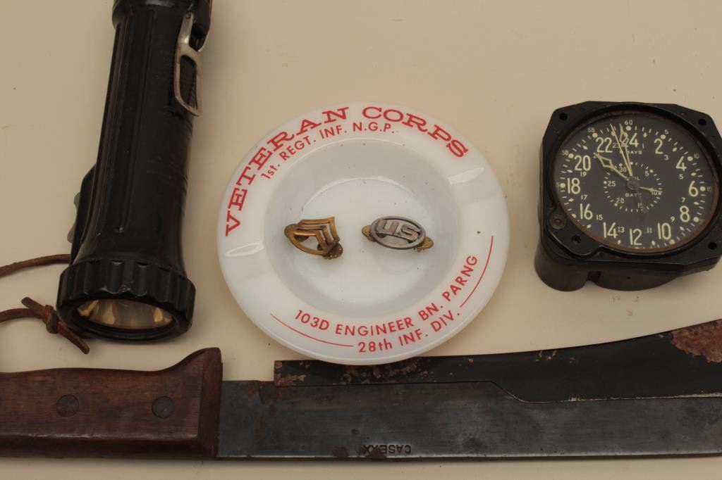 36 knife with leather sheath, a U.S.A.F. flashlight, a military gauge, a Veteran Corps. ash tray and a U.S. and Sgt. uniform insignia. Est.: $200-$400.