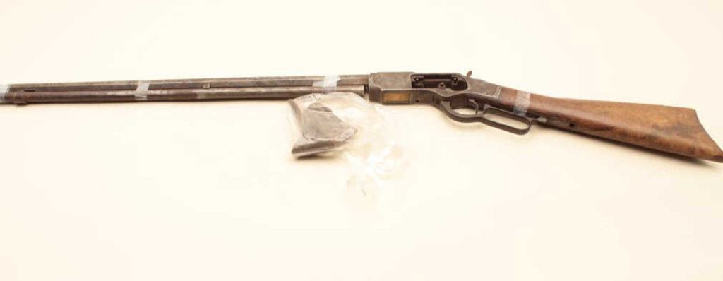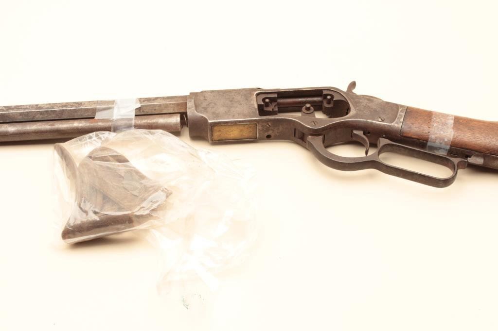 rifle is in fair overall condition with a 26” octagon barrel. All metal surfaces show a mottled grey patina with light to moderate surface erosion. The action is disassembled and the rifle is non-functioning. The dust cover is intact and the elevator reads, “.38 CAL.” The smooth butt stock is in place but is missing the butt plate and there is no fore arm wood. The consignor has included parts he believes came from this rifle. A little TLC and restoration would go a long way with this Winchester. (Antique). Est.: $300-$600.