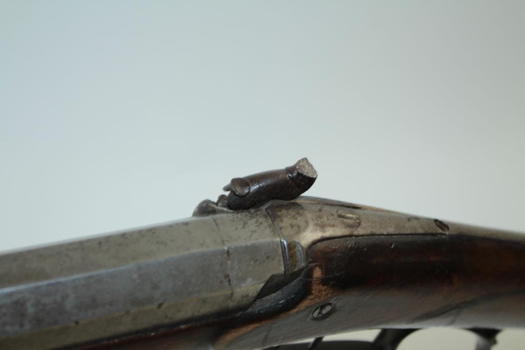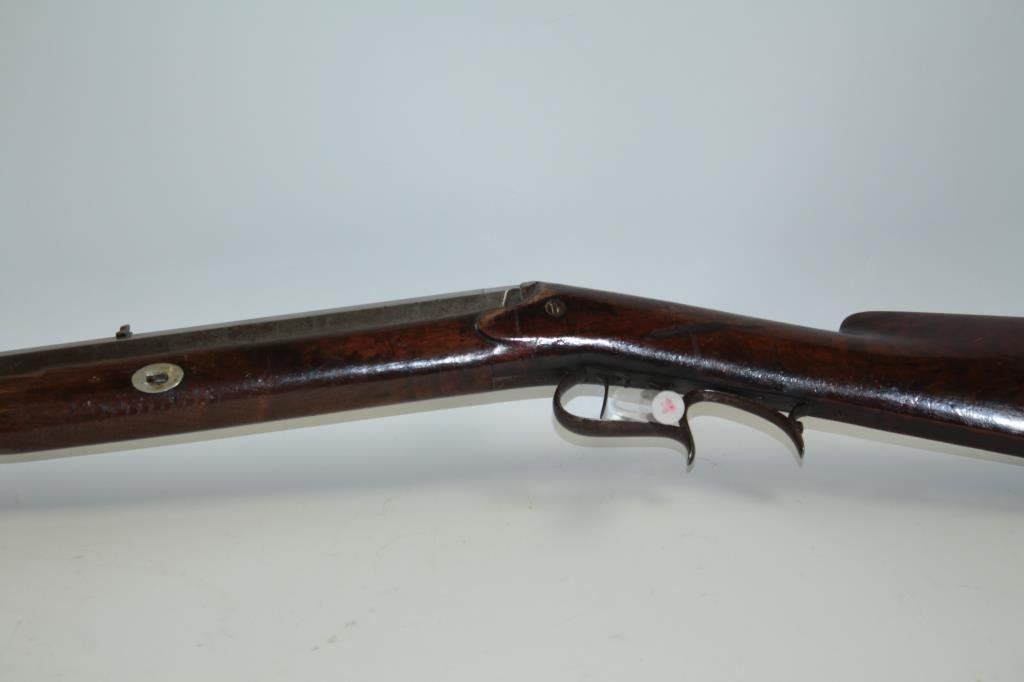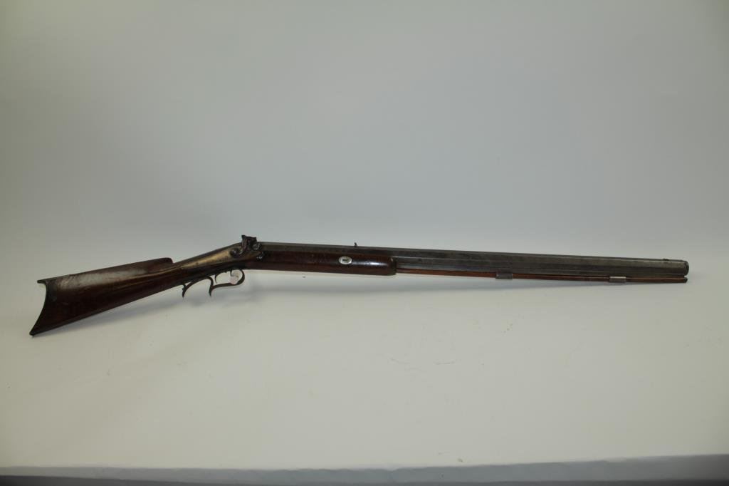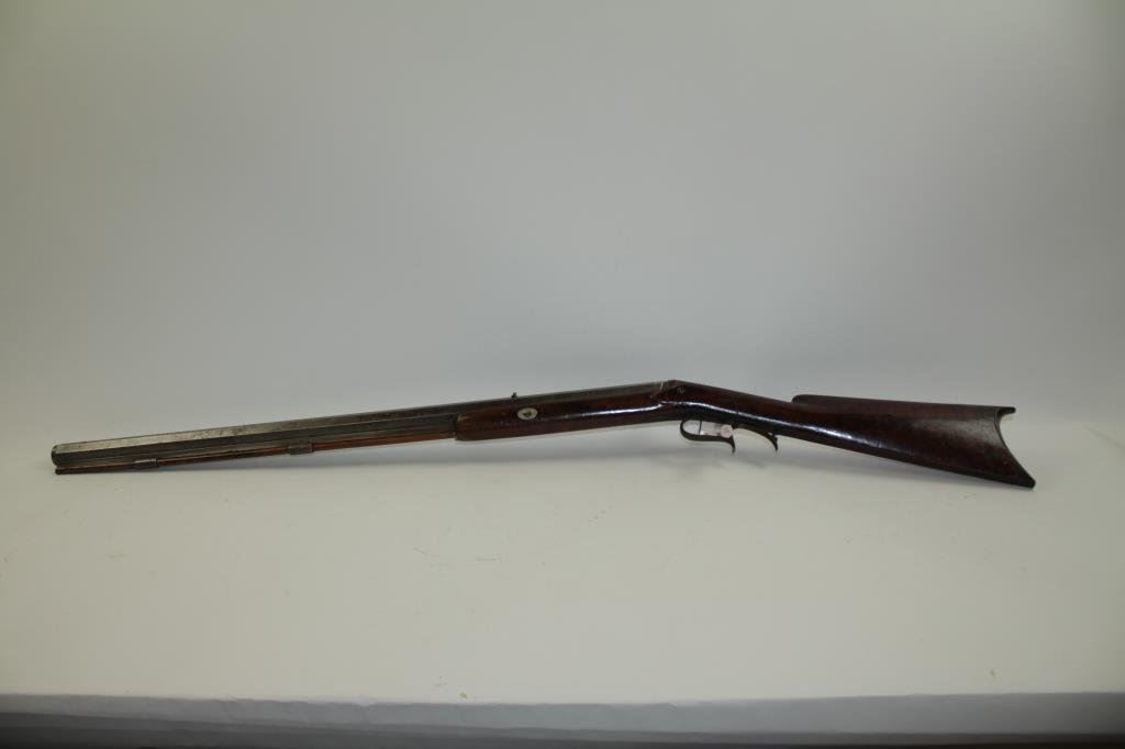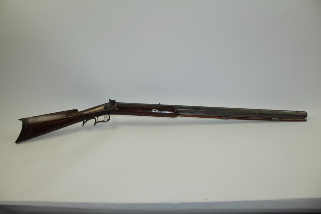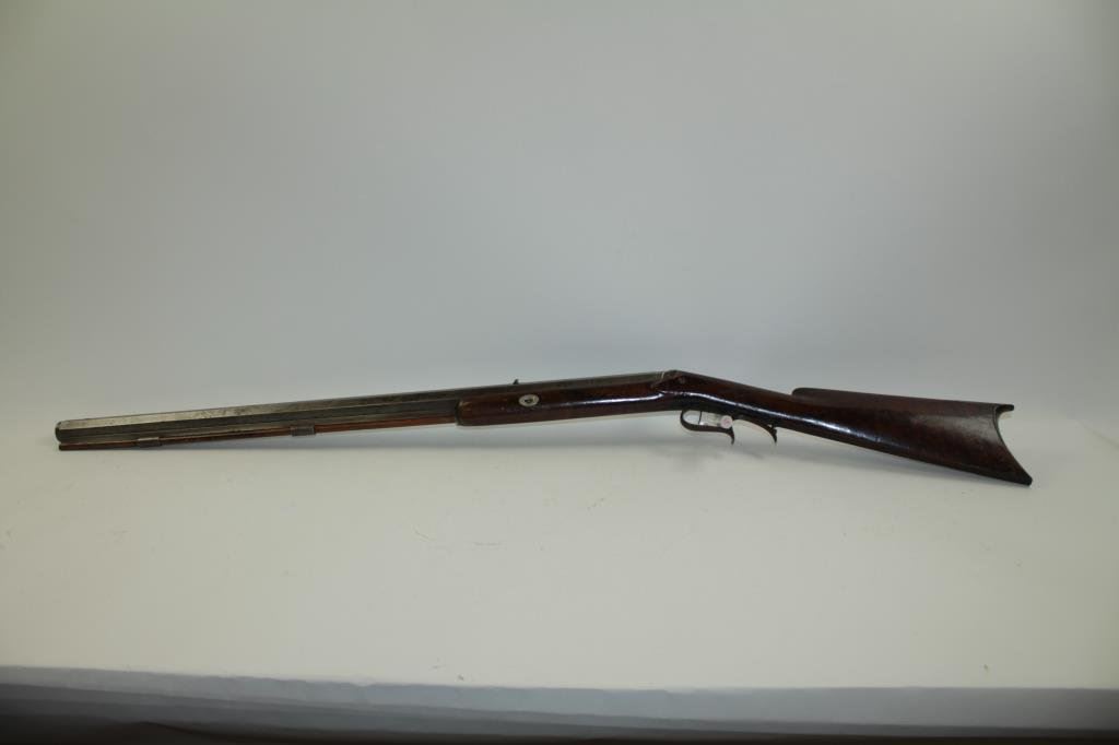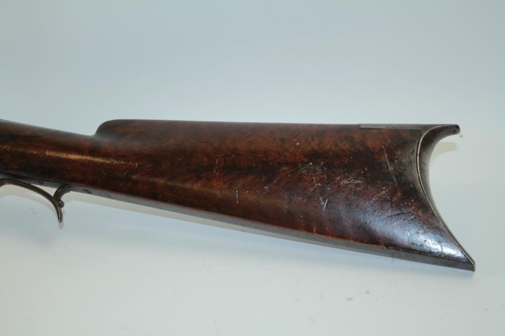 classic American styling. Measures 45 ½” overall with a 31” barrel of .44 caliber rifled with barrel measuring approximately 1” across the center and rounded muzzle for bullet starting. Iron trigger guard and butt plate. Marked “H.L. Siebert, 23 Main st, Cin. O”. (Cincinnati, Ohio) just up the river from Louisville and St. Louis! Gray patina finish with some light pitting and erosion. The hammer spur sheared off and missing. The stock has nice burl with many marks and scratched with a few small losses. Working well. Would improve with TLC and minor restorations. A quality rifle made on the route west. (Antique) Est.: $600-$1200
