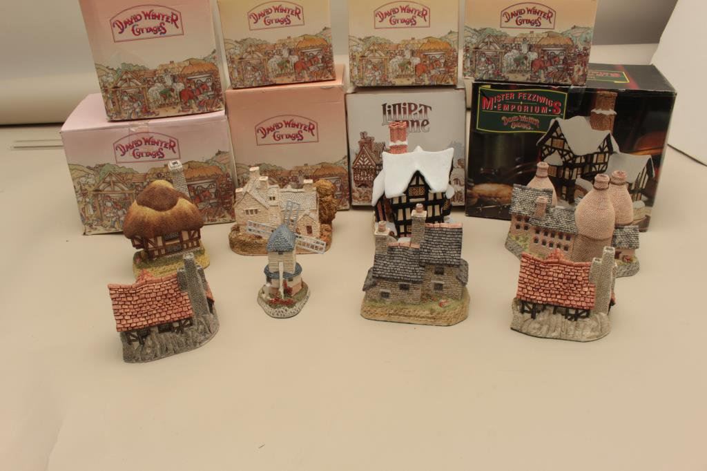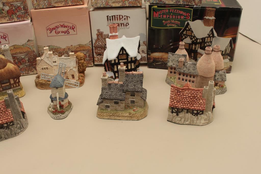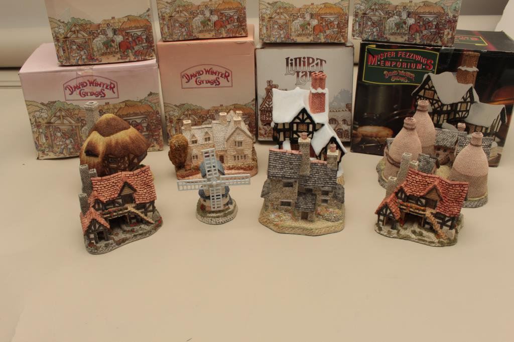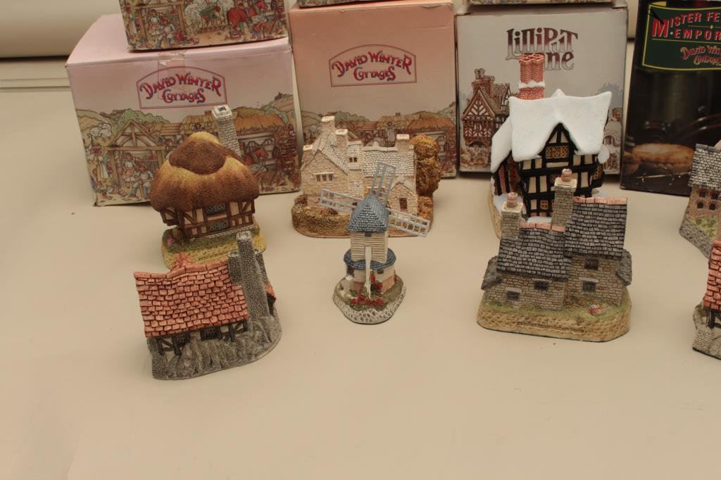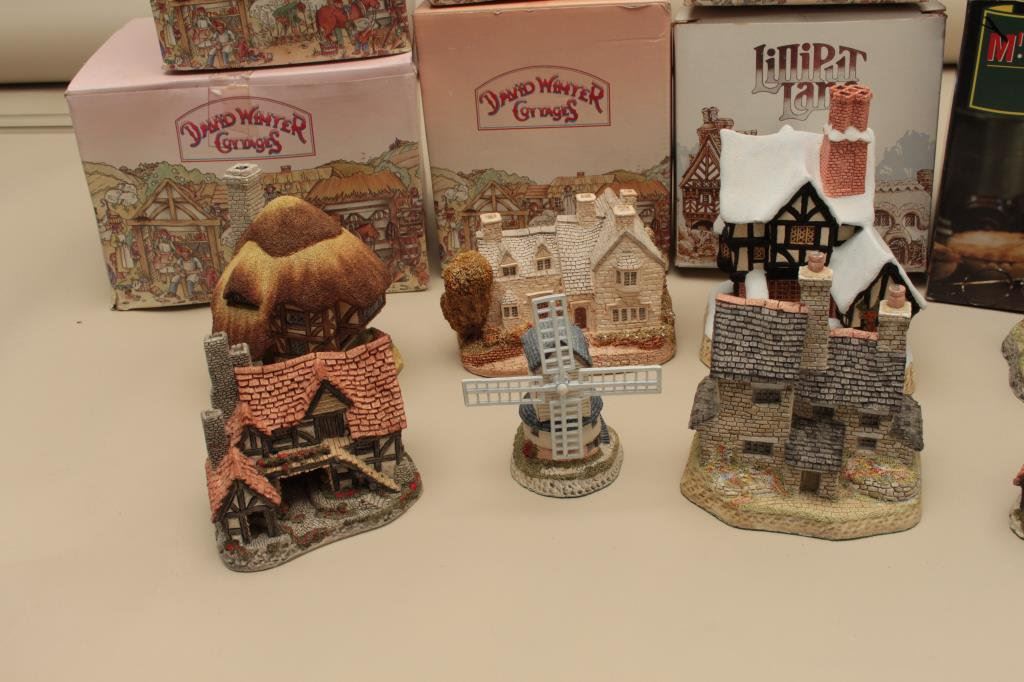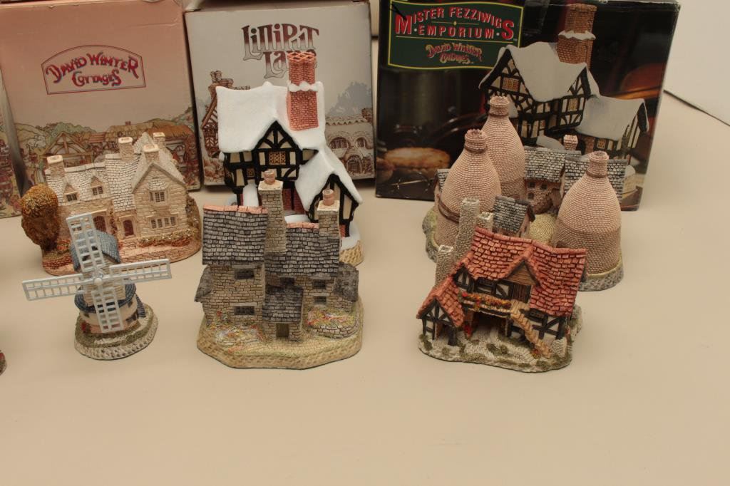 Kilns, The Bothy, Windmill, Pudding Cottage, Mister Fezziwigs Emporium and The Bothy. All hand made and hand painted in the Studios & Workshops of John Hine Ltd., Hampshire, Great Britain. Along with a Lilliput Lane Moreton Manor. Est:$100-200
