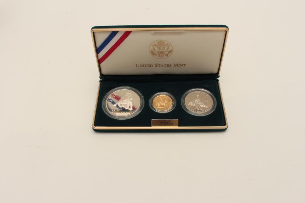 Gold Five Dollar, of Civil War Bugler Art by Don Troiani. Silver Dollar, Silver Half Dollar. Proof in Box with Certificate. Est:$300-600