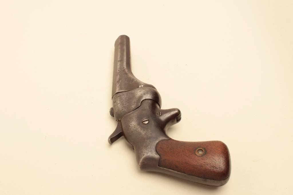 This pistol shows a brown patina finish with old wood grips and legible address. Some minor pitting and storage marks. An old west large bore belt pistol that shot the same cartridge at a Henry and 1866. (Antique) Est.: $250-$500