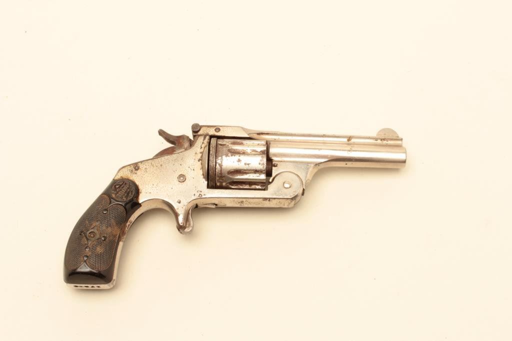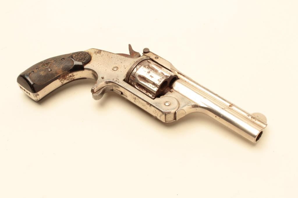 S.A. revolver resembling a S&W, S/N 17016. 75%-85% original nickel remains. The grips are very good and the cylinder is not revolving. Minor erosion and pitting. Scarce. (Antique) Est.: $250-$500