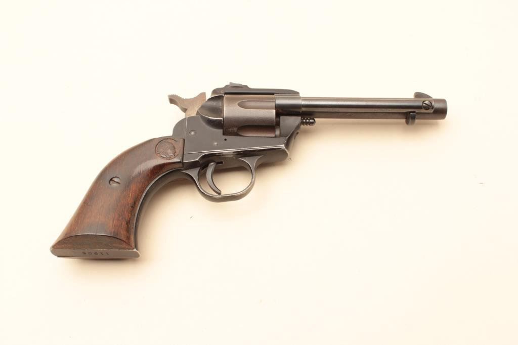 resemble S.A. revolver in the 1950’s to 60’s. Very good plus overall. Indian head grips. 70%-80% condition overall. Scarce (C&R/PPT) Est.: $150-$300