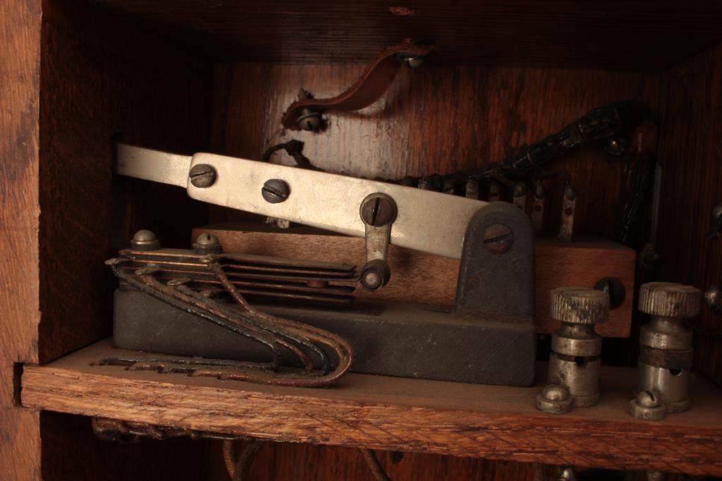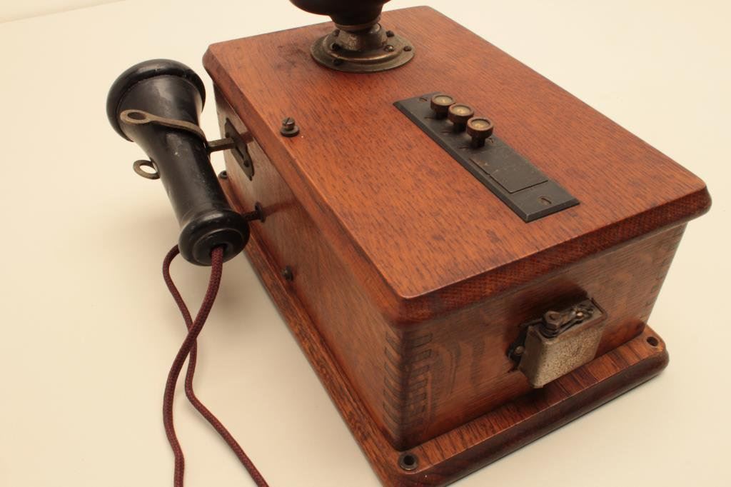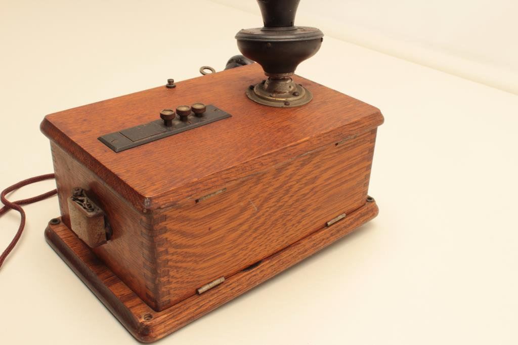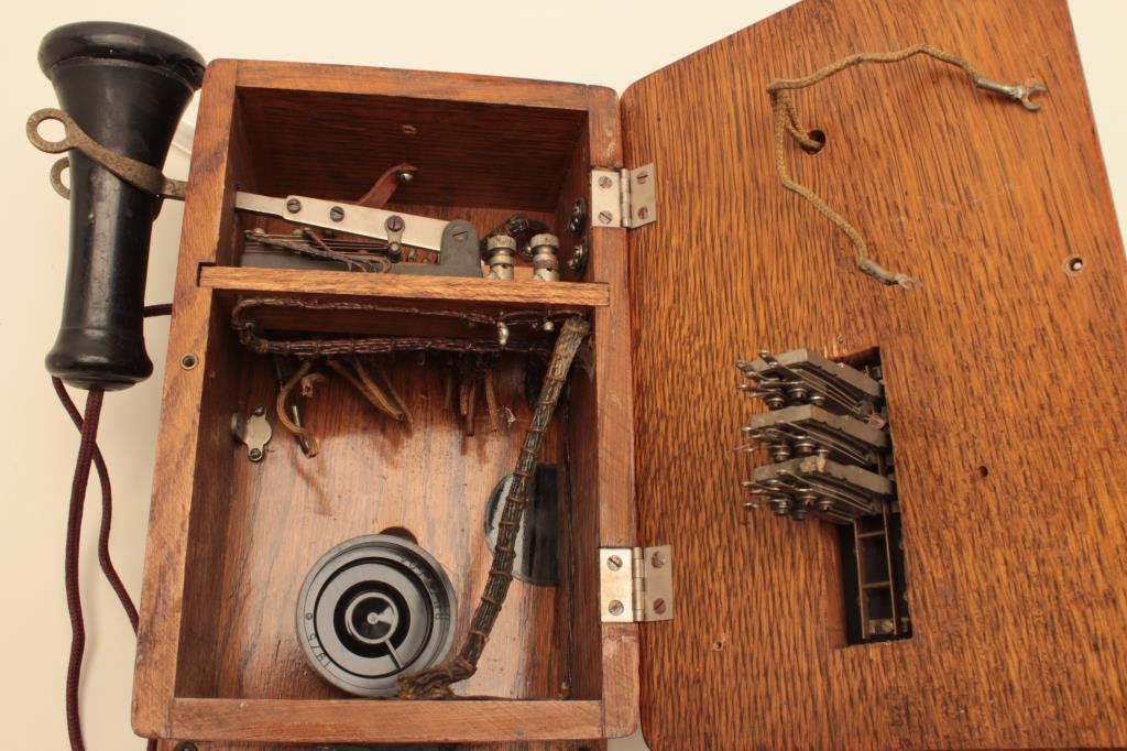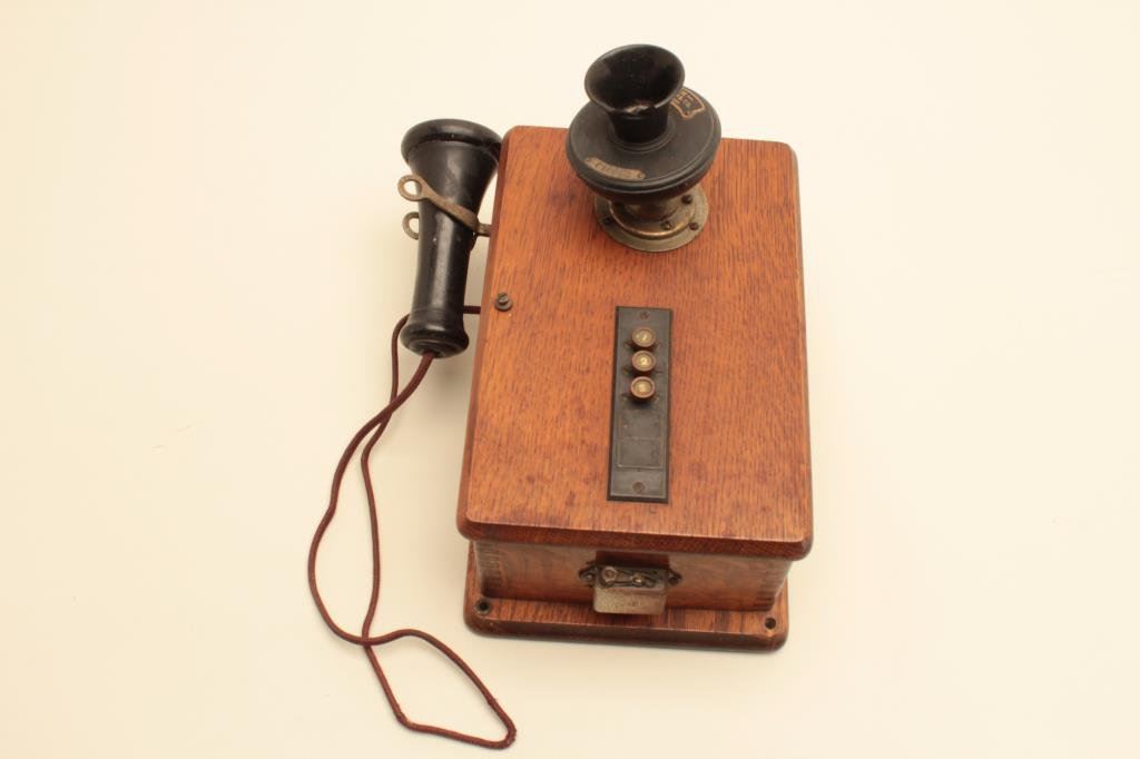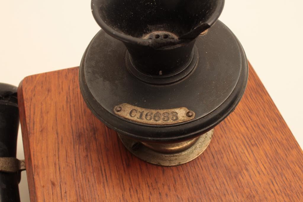 is in good overall condition with chips missing from the mouthpiece and earpiece attachments. The wooden box is in very good condition with mounting hardware intact. The phone is serial #C16633. A nice decorator piece circa the 1920’s. Est.: $50-$100.