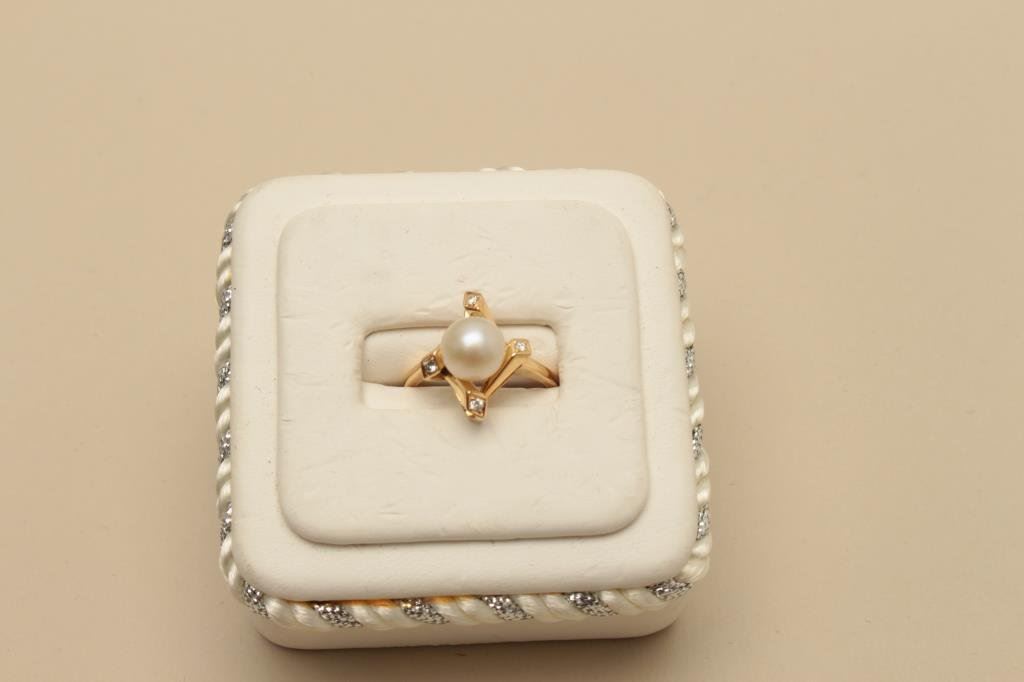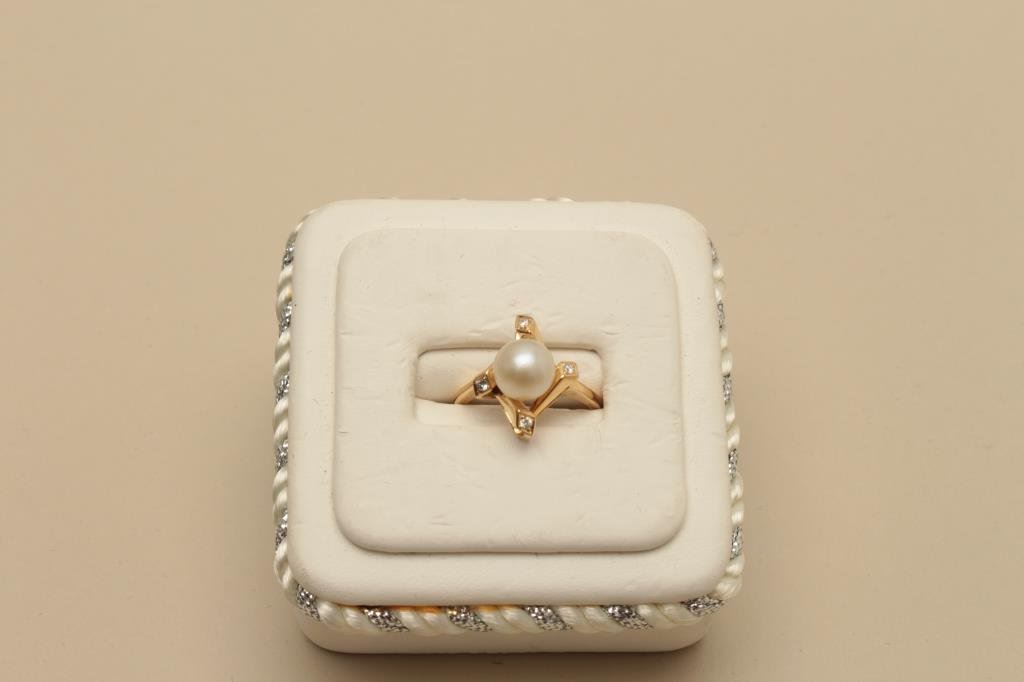 Lot 1438 7mm pearl ring with 4 diamonds 18kt YG. Antique. Est.: