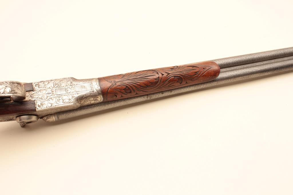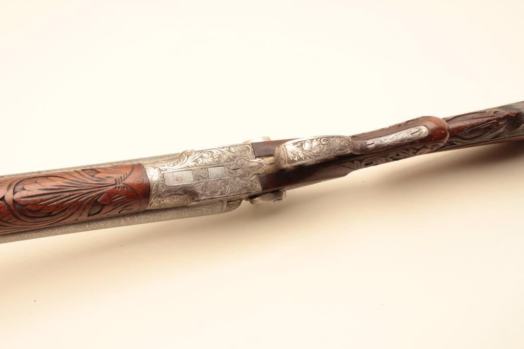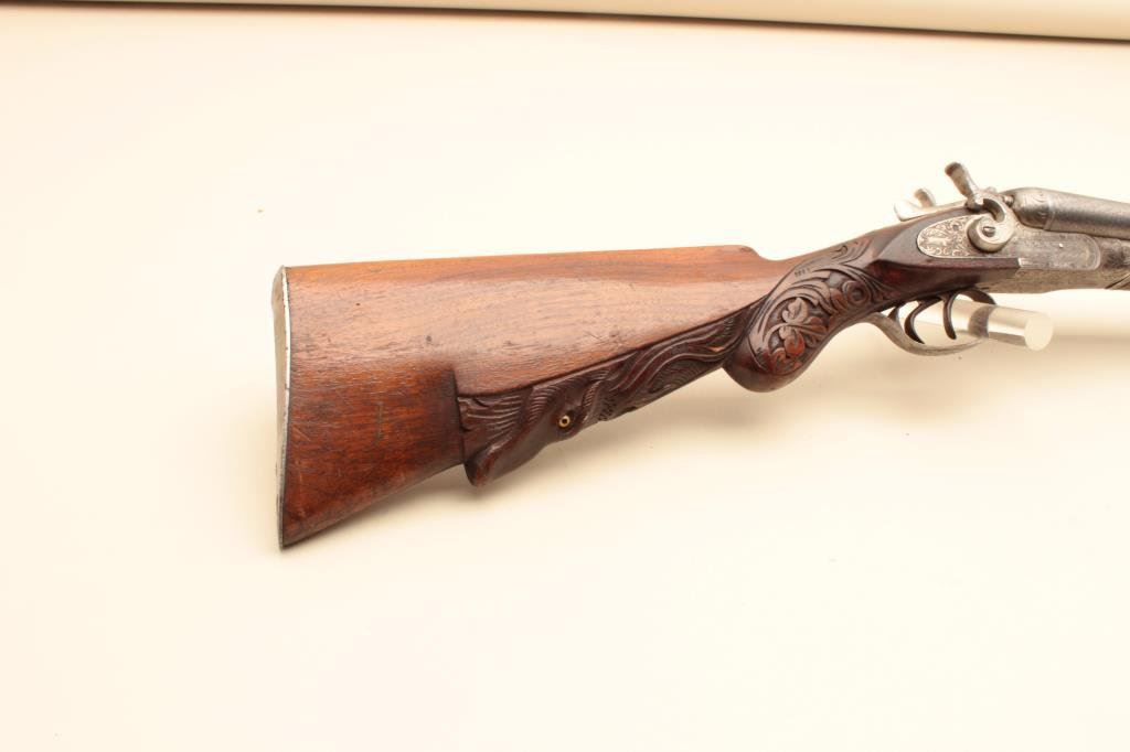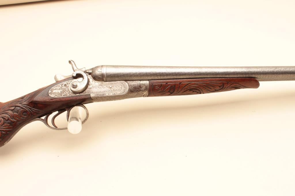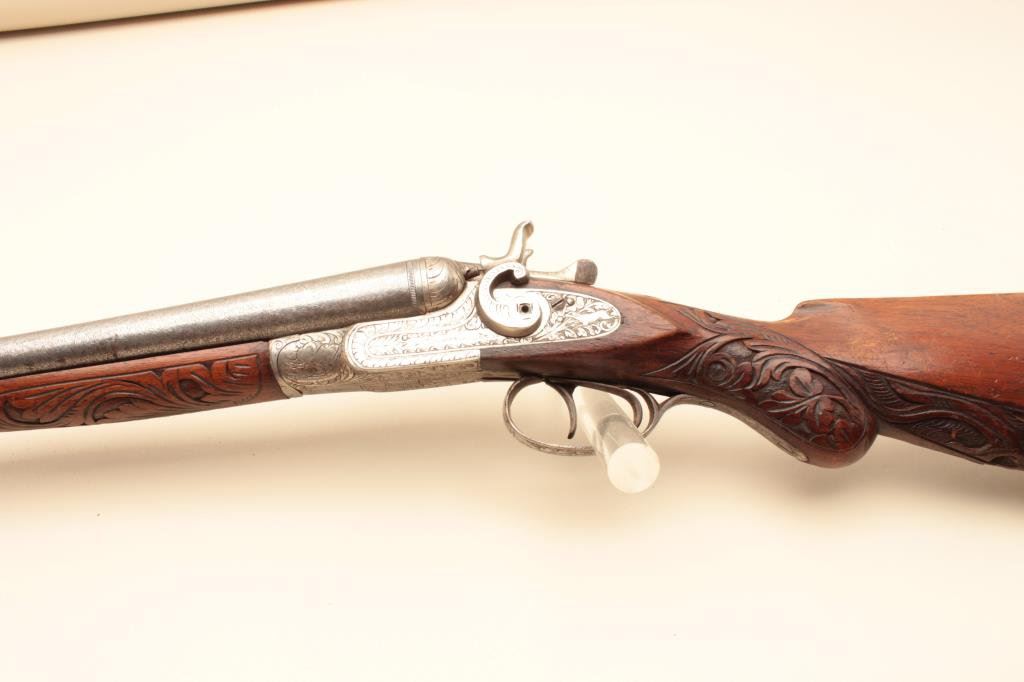 Co. (Most likely Belgium made and imported). 30” Damascus patterned (engine turned) barrels, engraved locks with fancy carved stocks. Very good plus to almost fine showing bright polished metal surfaces and nickeled frame. The left hammer screw is missing. The action is tight. The bores are almost fine and the wood is very good with scratches and aging. Very showy. (C&R) Est.: $350-$700