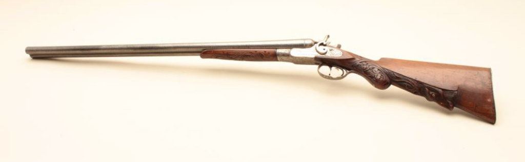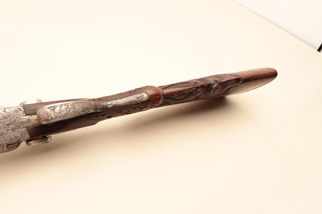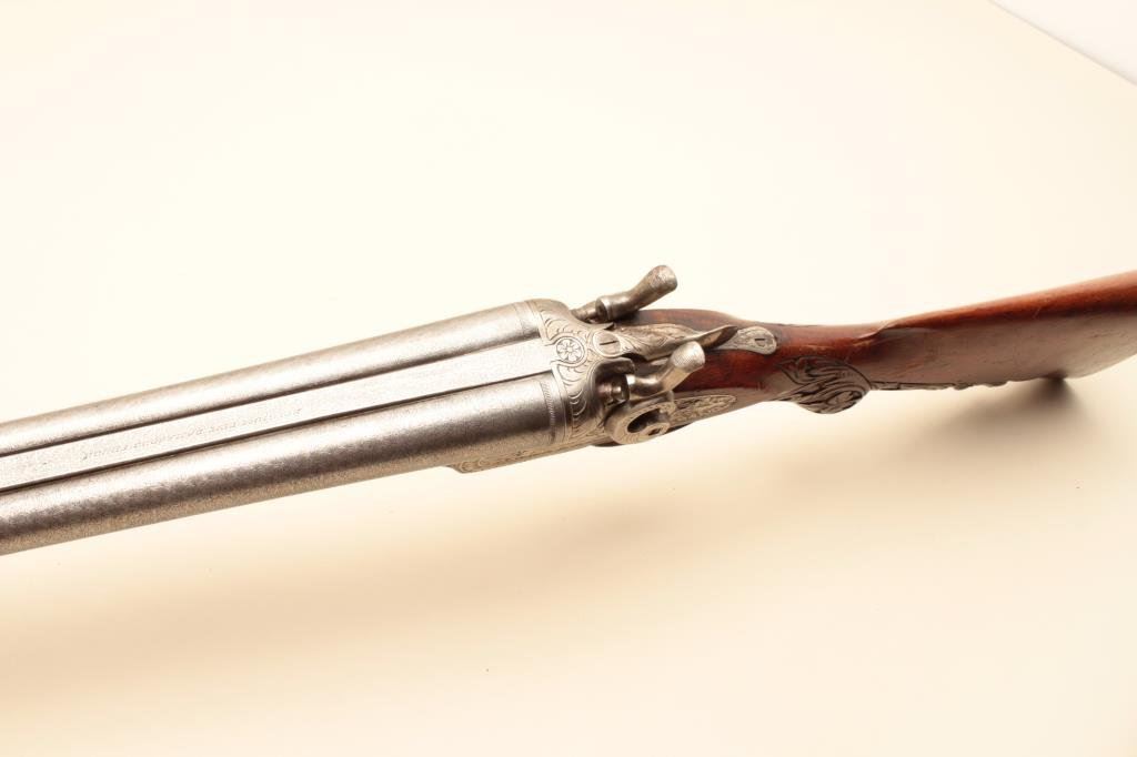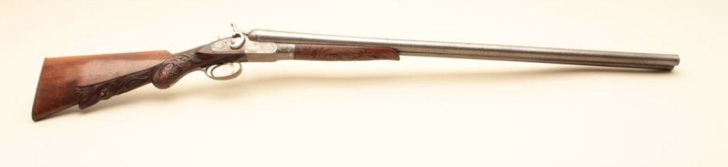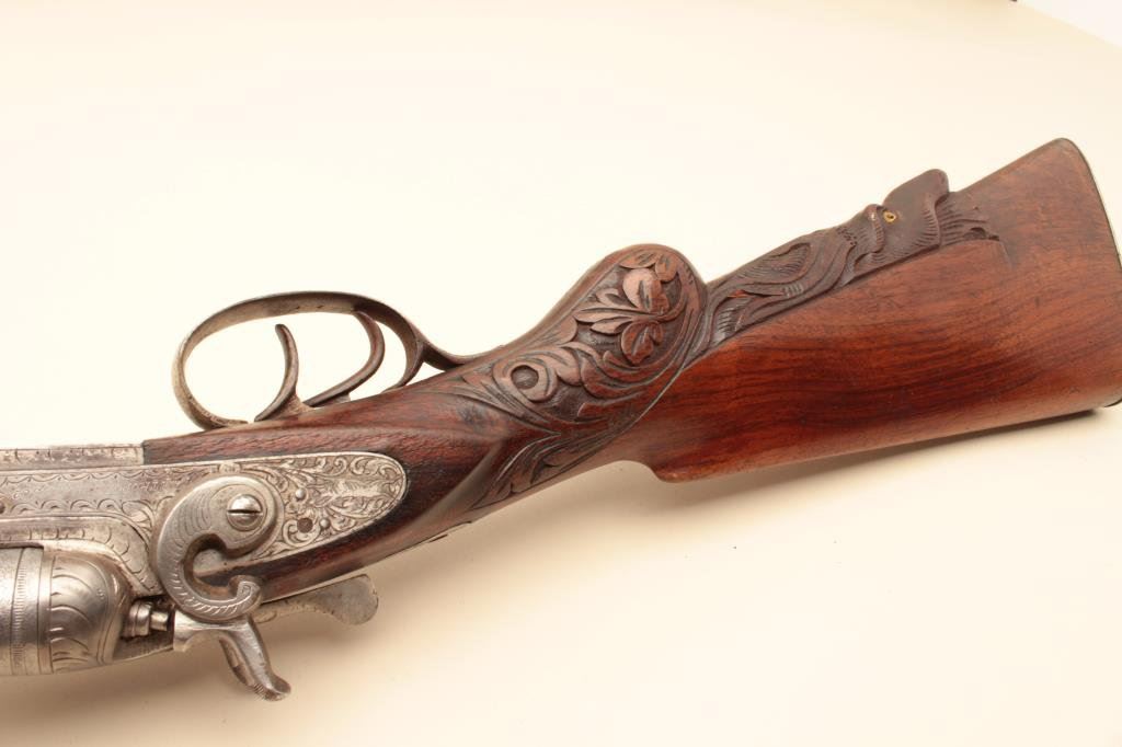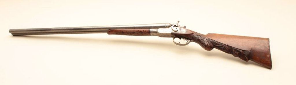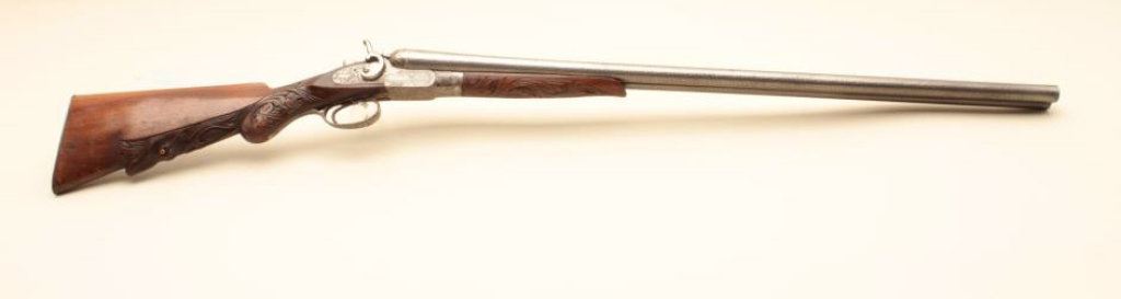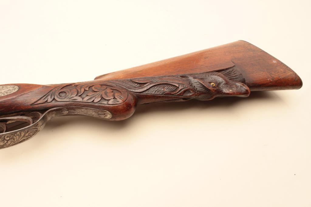 Co. (Most likely Belgium made and imported). 30” Damascus patterned (engine turned) barrels, engraved locks with fancy carved stocks. Very good plus to almost fine showing bright polished metal surfaces and nickeled frame. The left hammer screw is missing. The action is tight. The bores are almost fine and the wood is very good with scratches and aging. Very showy. (C&R) Est.: $350-$700