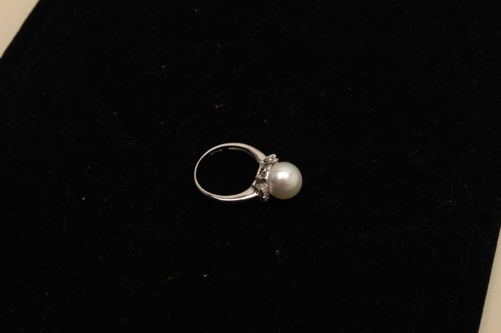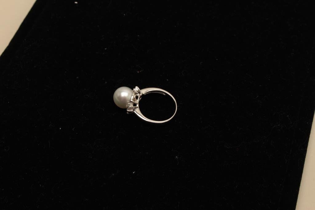 Lot 1447 10mm Akoya pearl ring with 6 side diamonds. Platinum 5.8gr.