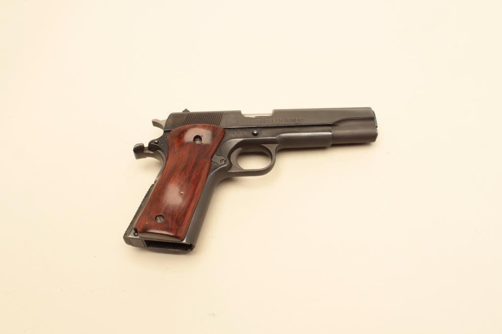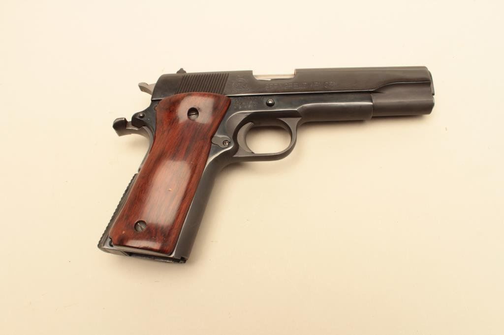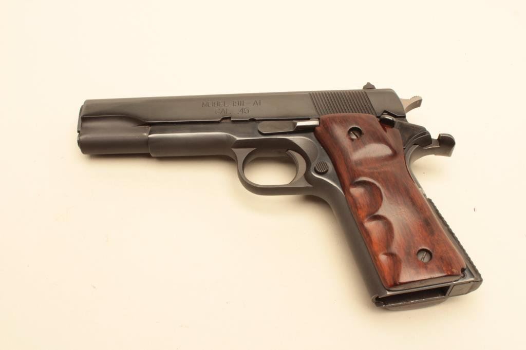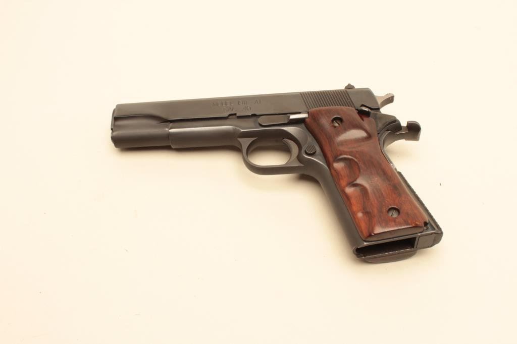 custom blued finish, custom hardwood grips, S/N M45497, in overall very good + condition as customized; good bore, crisp action and markings, very good custom grips. (Modern/PPT). Est.: $400-$800.