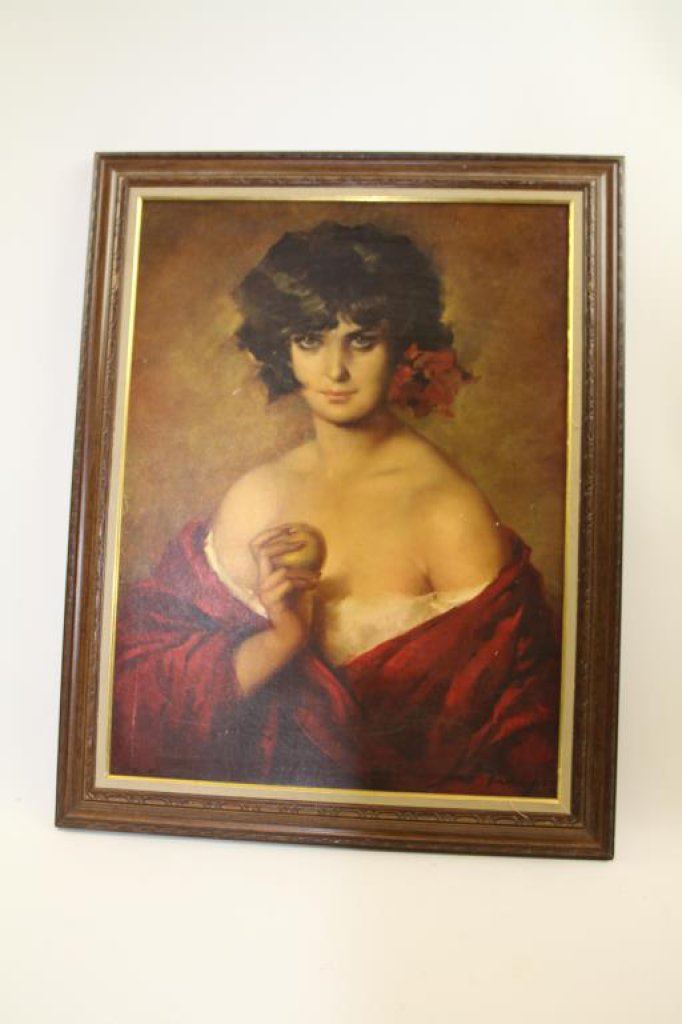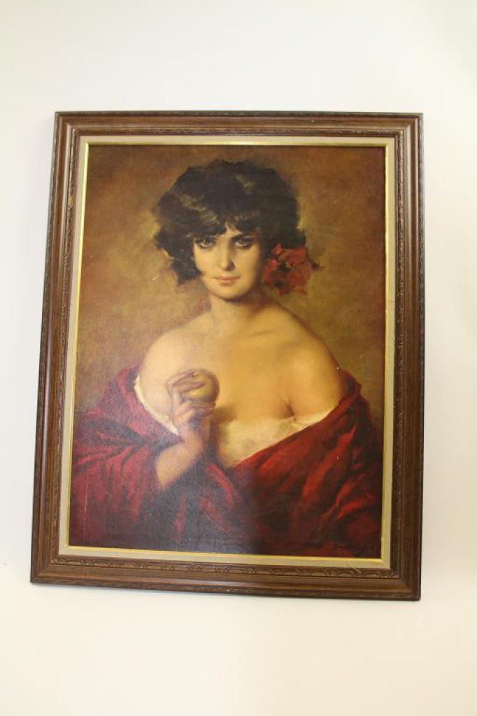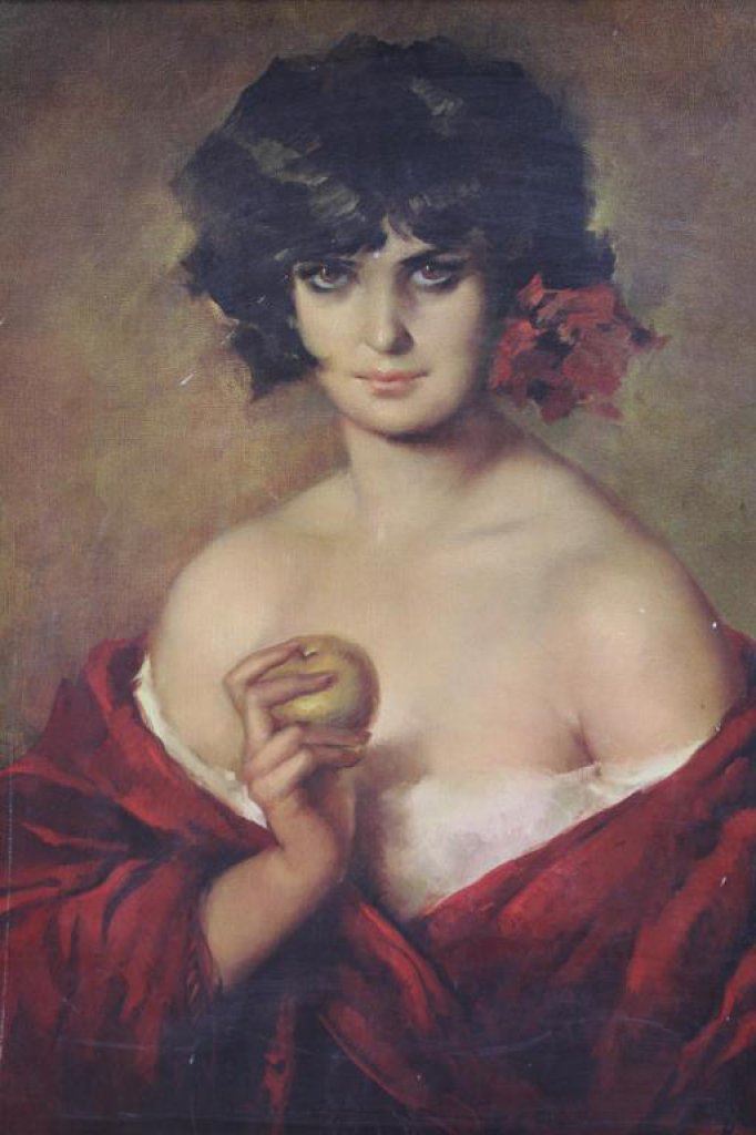 lady with fruit titled on the back “Spanish Beauty”. Measures approximately 23 ½” x 17 ½” image only. Minor scratches, cracking, and in need of minor conservation. Est.: $175-$350