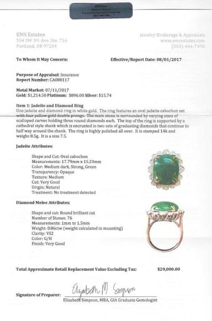 carats with Full certificates stating as Natural and NO treatments, very rare this size and color and surrounded by 76 round diamonds weighing approx 0.90 carats of G-H colors and VS clarity set in a 14 karat white gold scalloped design setting. Full retail Appraisal at 29000 Est:$8000-15000