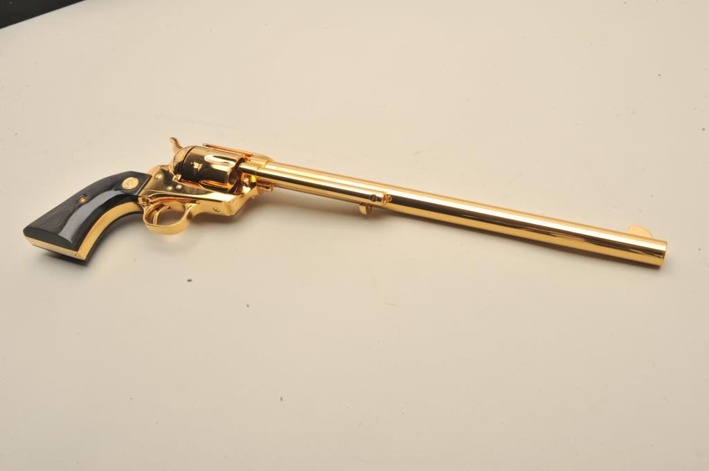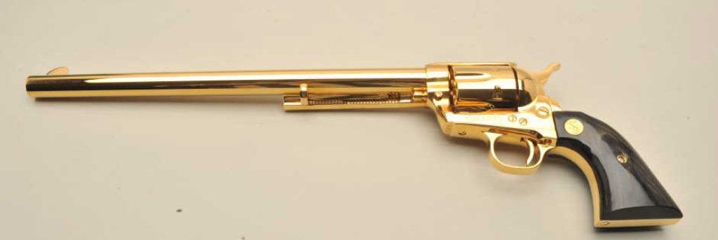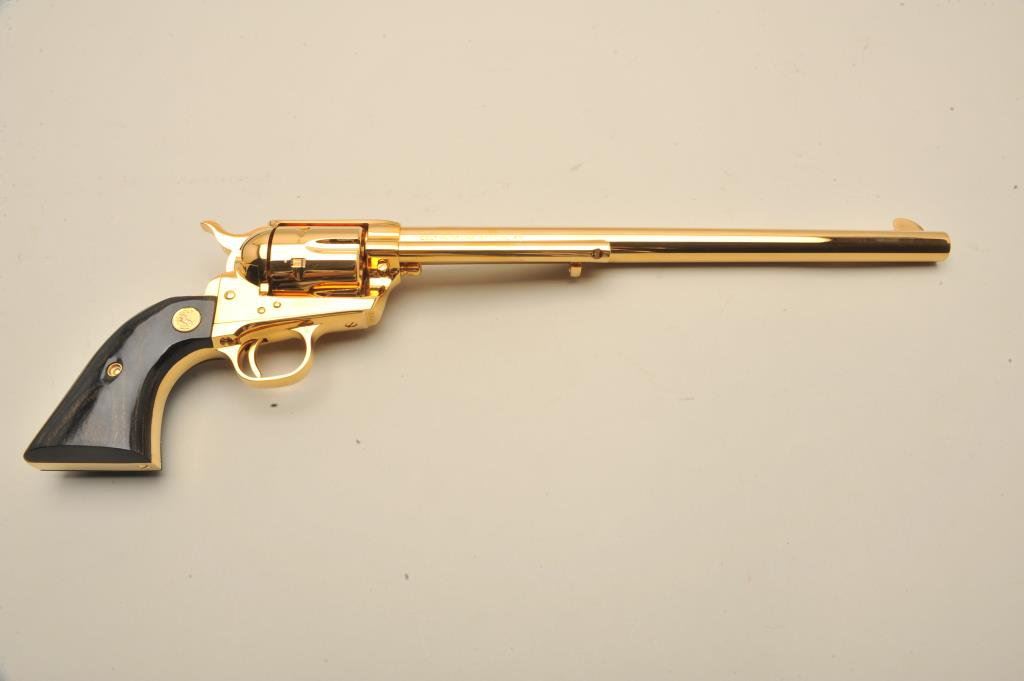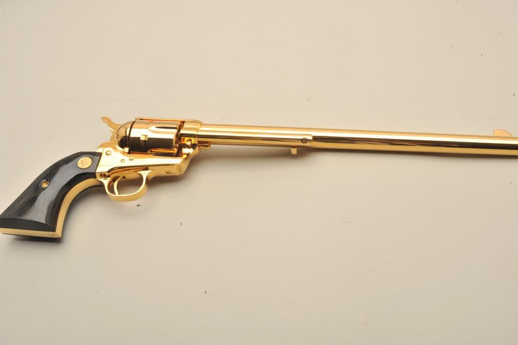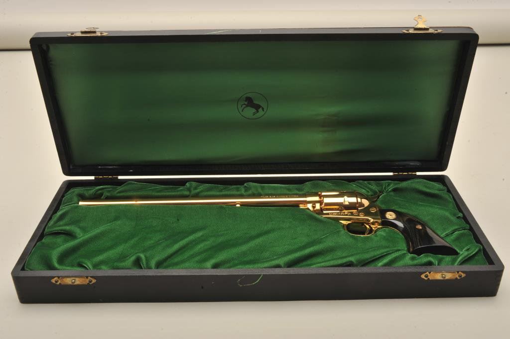 a 12” barrel, rare factory gold plate, select gold medallion grips, S/N 0106WE. Buntline barrel is #3681. Excellent to mint in correct green colored presentation display case. 1 of only 150 produced in the 1960’s with gold finish making this among rare among commemorative Colt’s 99%+ to mint. No evidence of firing or use. Minute handling only. (C&R/PPT) Est.: $2500-$5000