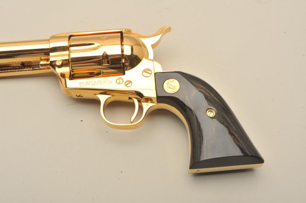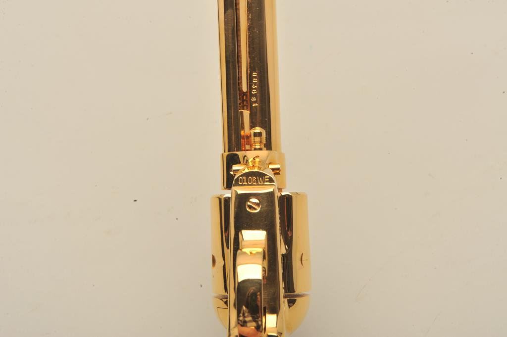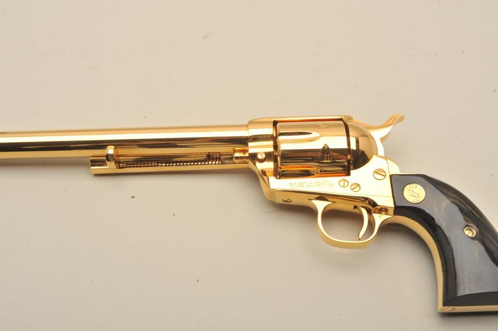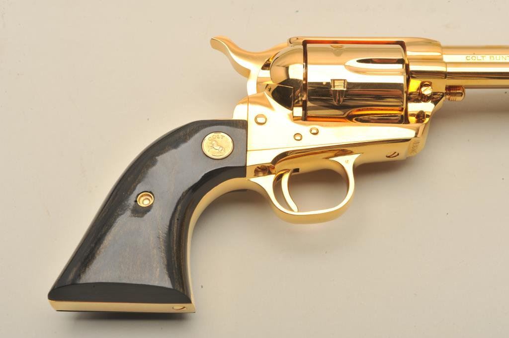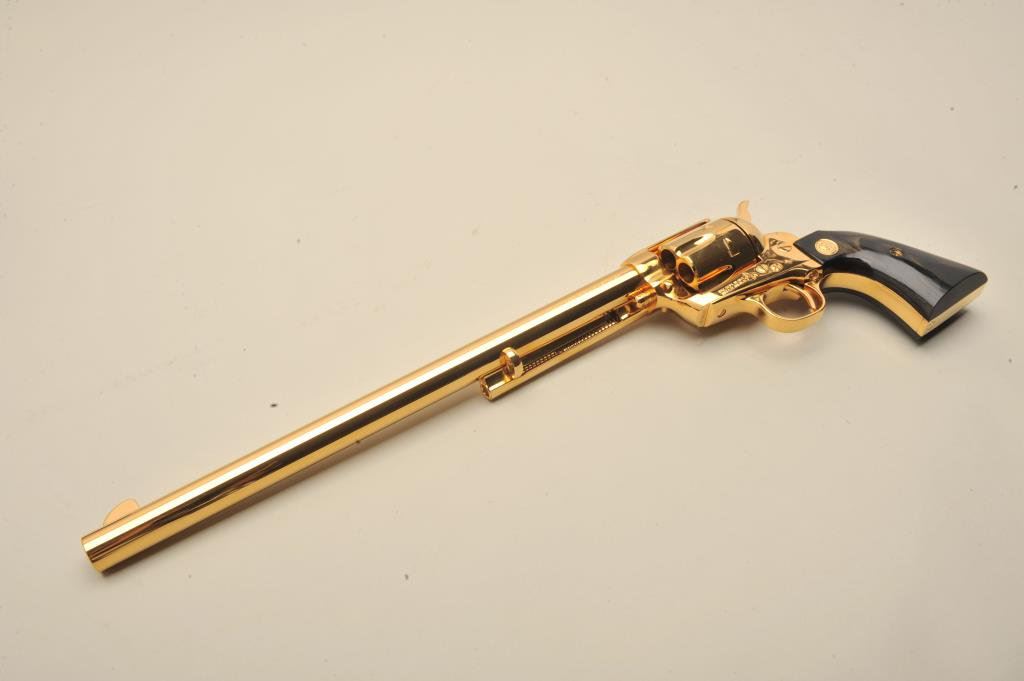 a 12” barrel, rare factory gold plate, select gold medallion grips, S/N 0106WE. Buntline barrel is #3681. Excellent to mint in correct green colored presentation display case. 1 of only 150 produced in the 1960’s with gold finish making this among rare among commemorative Colt’s 99%+ to mint. No evidence of firing or use. Minute handling only. (C&R/PPT) Est.: $2500-$5000