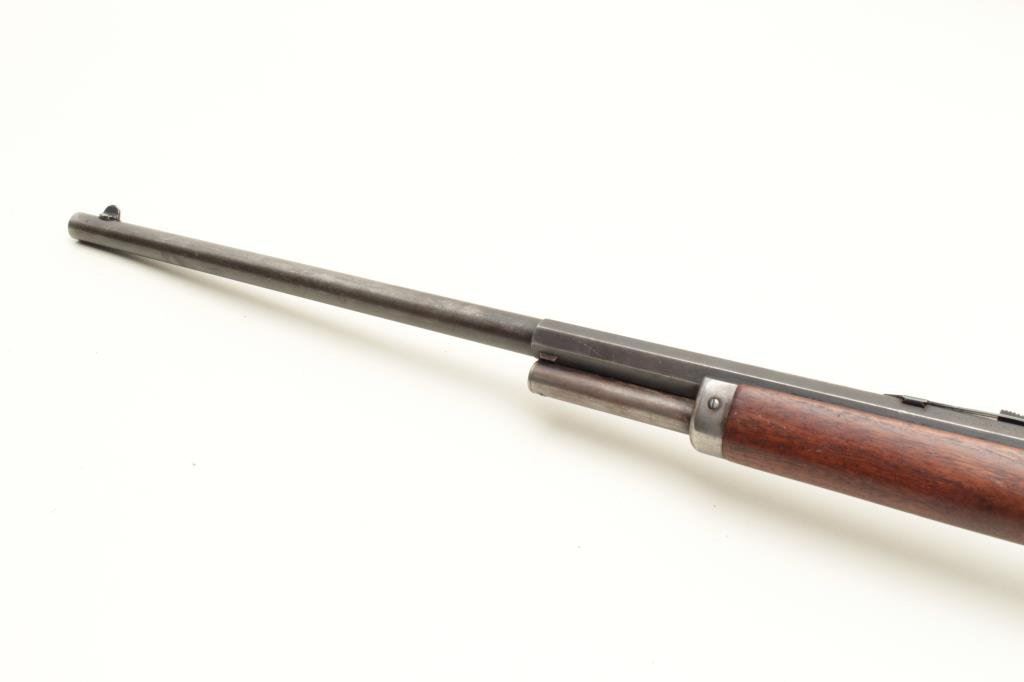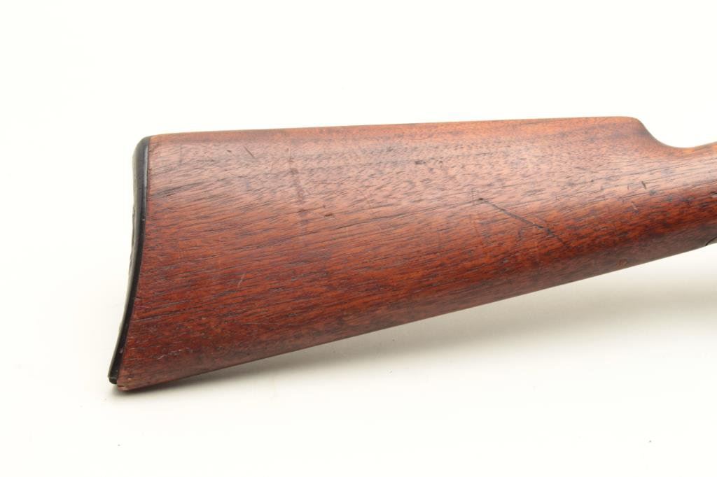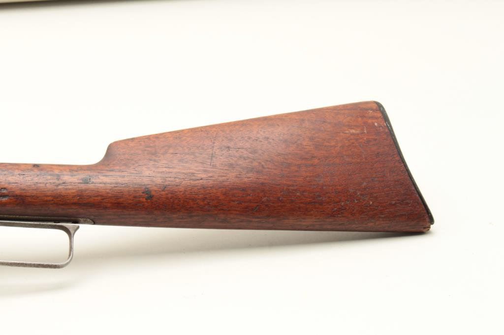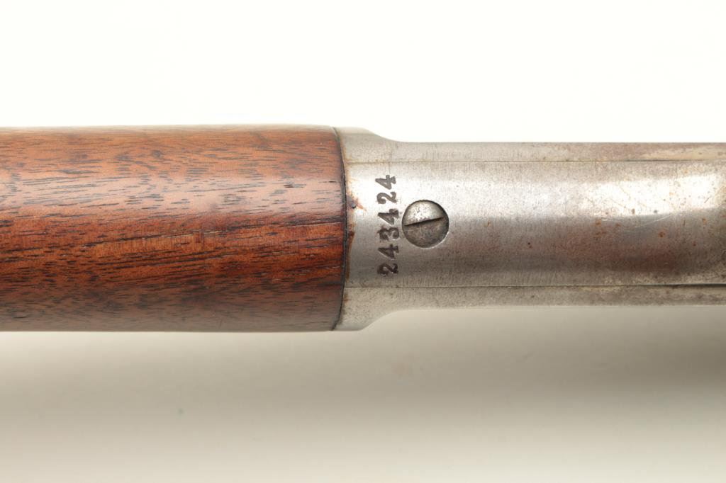 credit to Winchester caliber) with 26” half round and half octagon barrel, half mag, hard rubber butt plate for shotgun type butt, S/N 243424. 40%-60% original thinning blue on the barrel and tube. 25%-50% toning case hardening with light rainbow hues still visible. The stocks are good with minor dings and scratches. Good markings. Chip to the toe of the stock and butt plate. Good action and good bore. (C&R) Est.: $400-$800