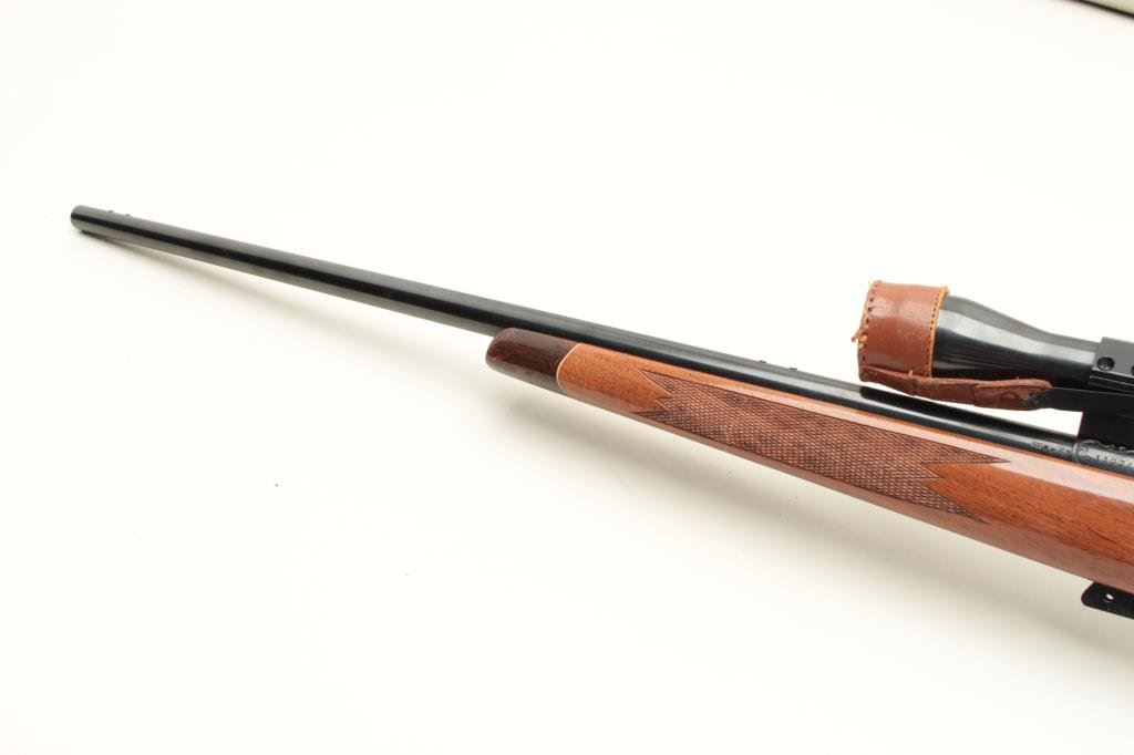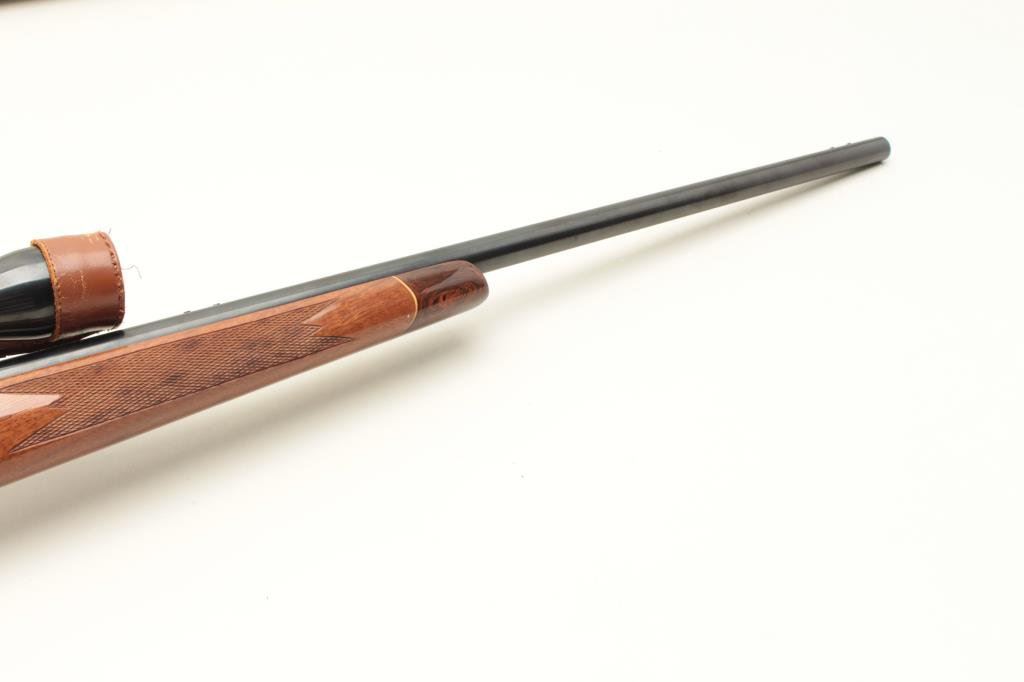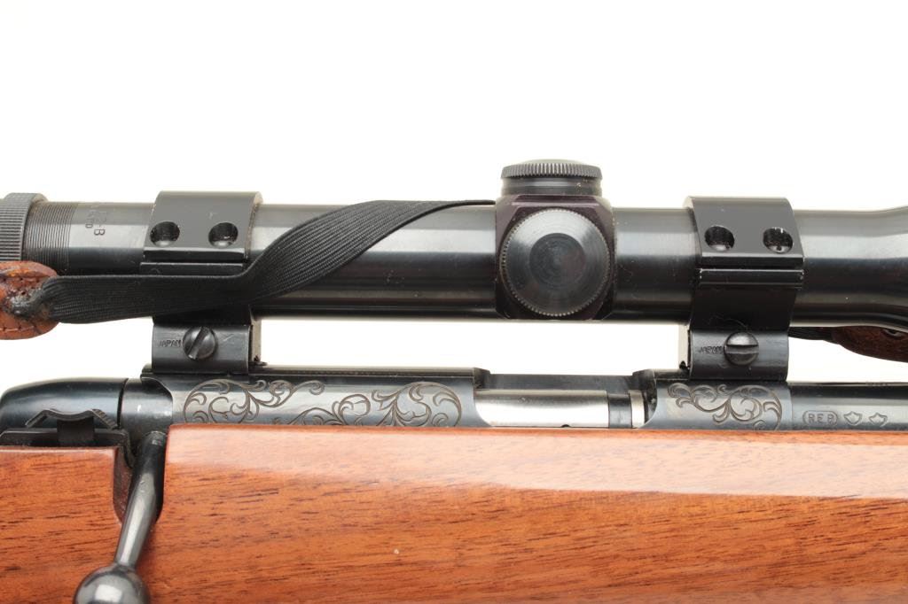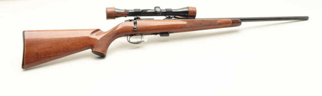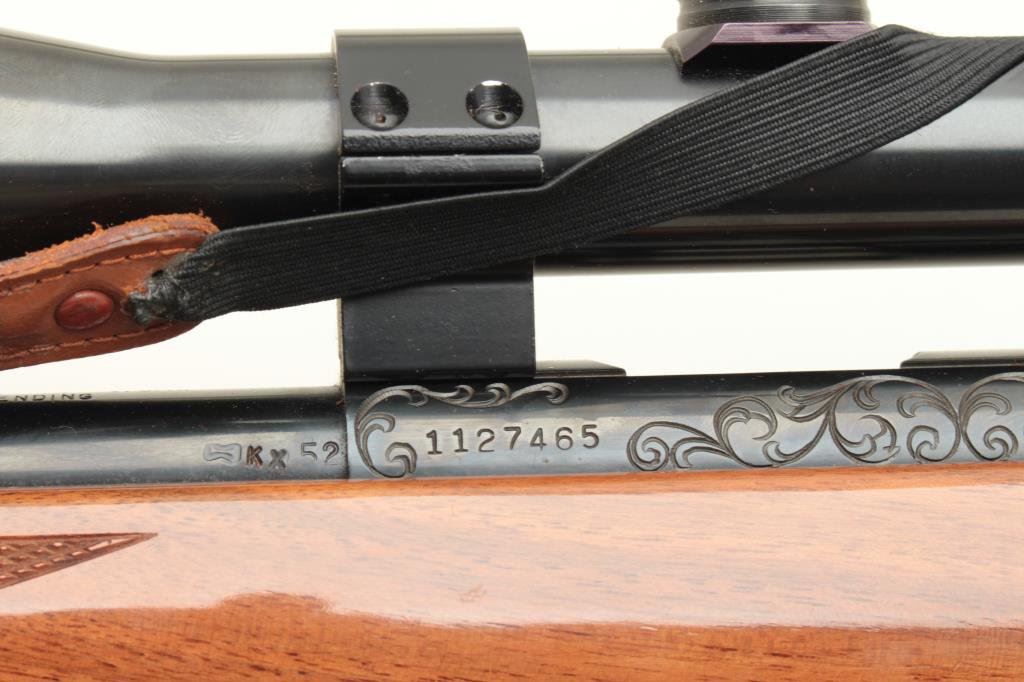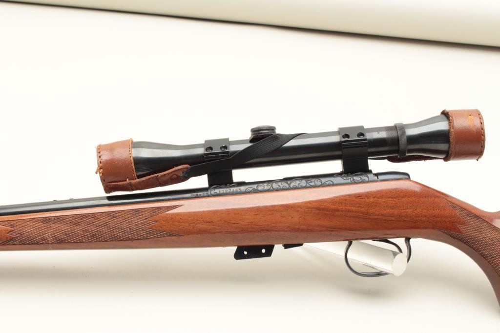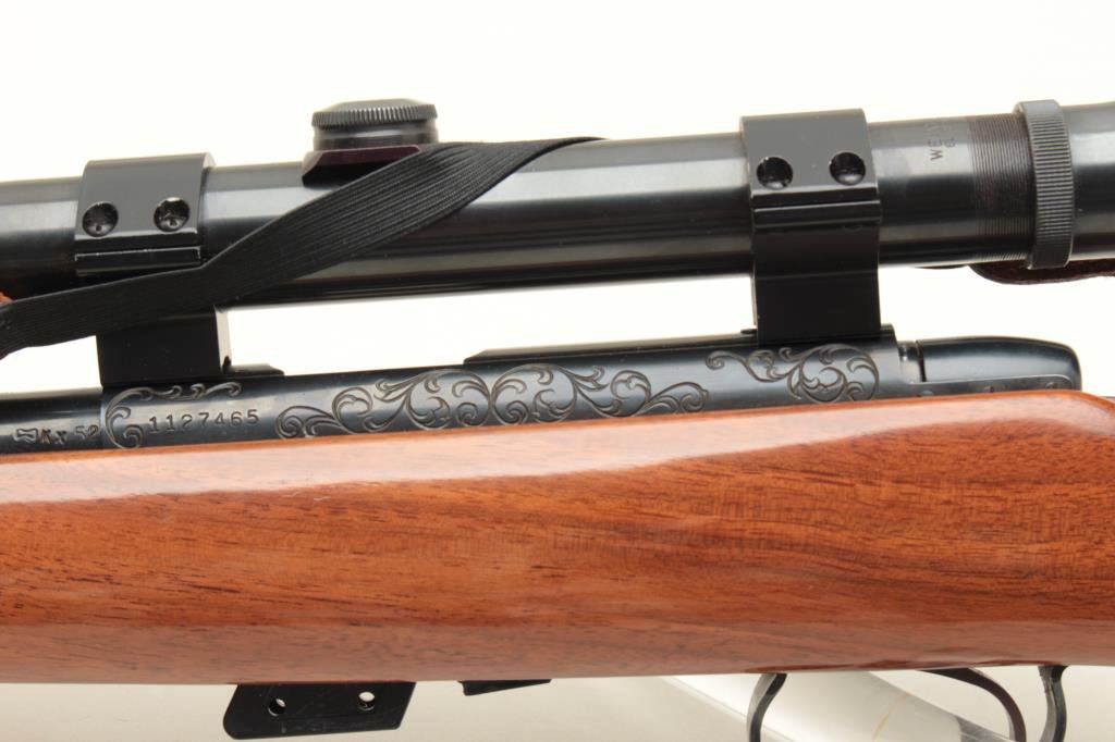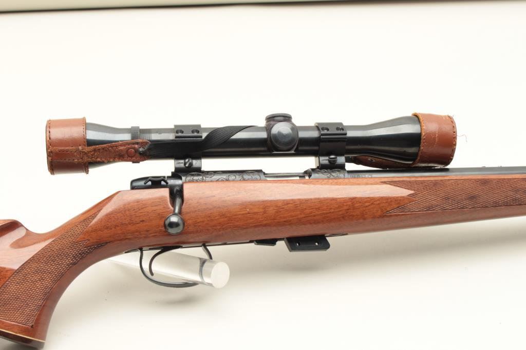 or LR caliber, 24” barrel, custom engraved, blued finish, checkered wood stock, S/N 1127465, mounted with a Weaver K4 scope displaying sharp optics; gun is in overall fine condition. (Modern). Est.: $400-$800.