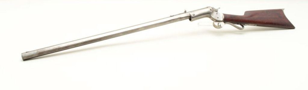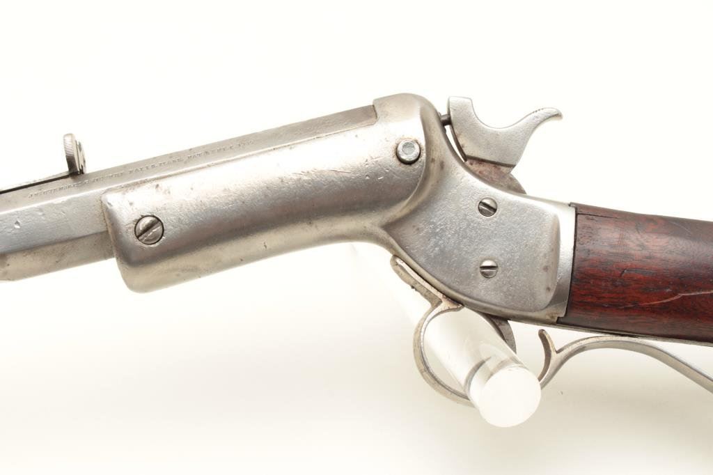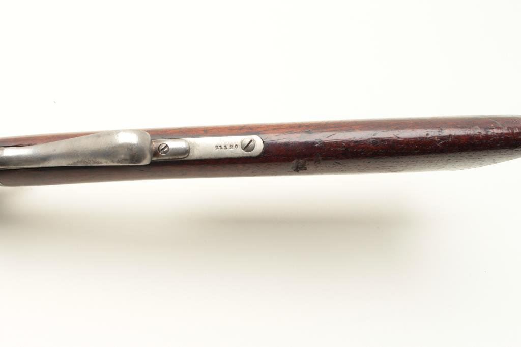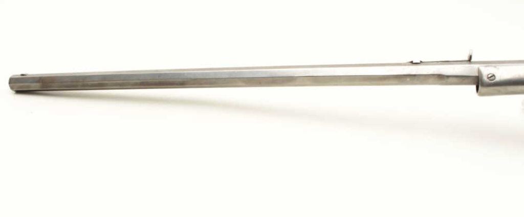 with a 28” slightly heavy octagon barrel, S/N 21120. Measures approximately 7/8” across the center of the barrel. Cleaned to gray metal with some slight pitting and erosion. Release button for action replaced. Rear sight has been replaced with buckhorn but is missing the elevator and front sight blade is also missing. The stock is fair to good with scratches and small losses. Good address on the barrel. The bore is fair to good with some wear. (C&R) Est.: $300-$600