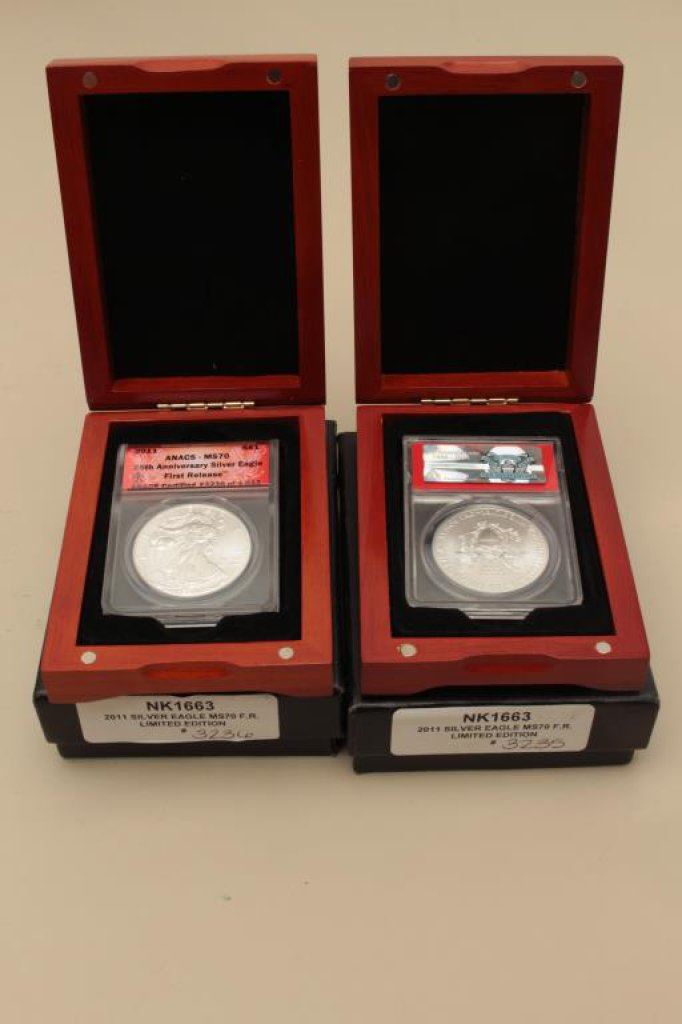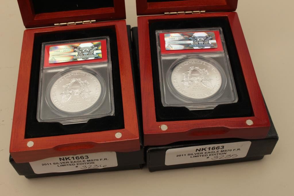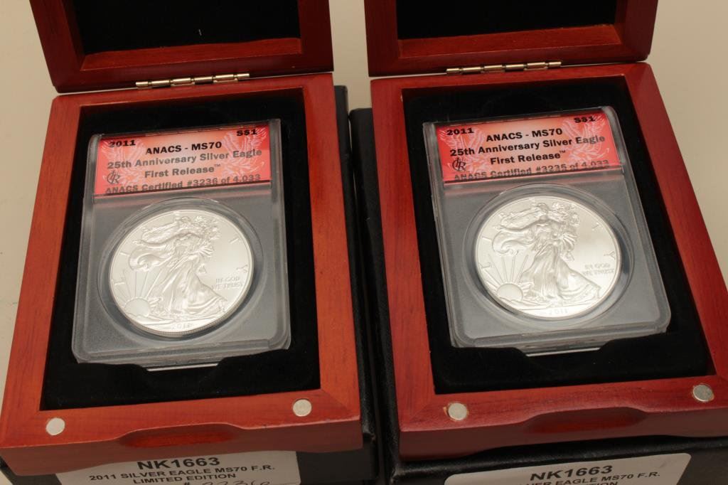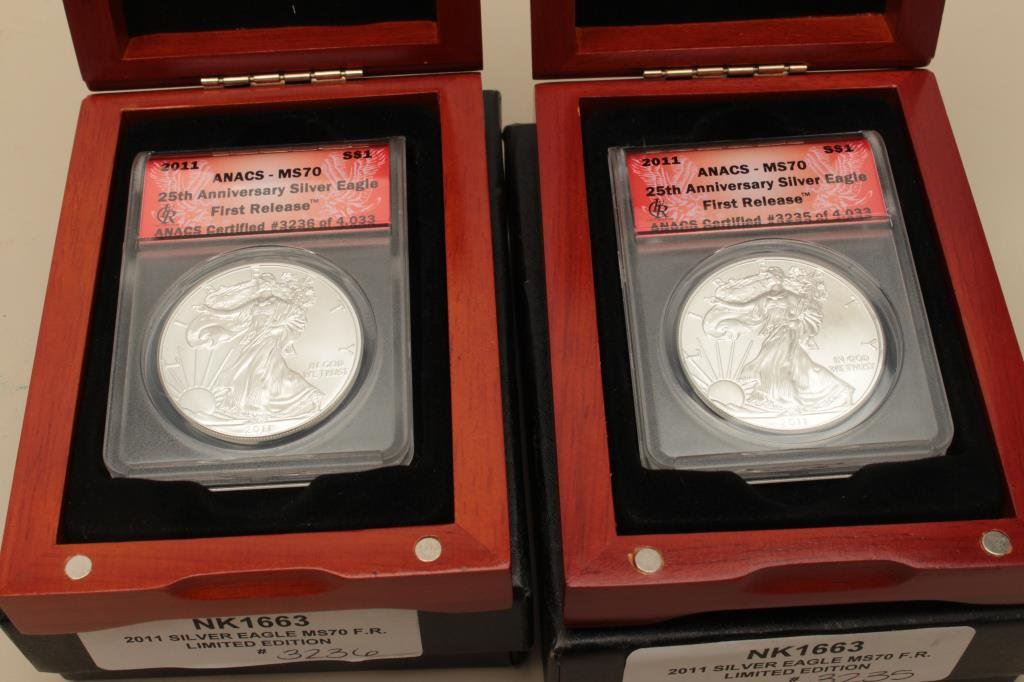 Lot 1652 Two 25th Anniversary Silver Eagle First Release coins; ANACS-MS70 slabbed