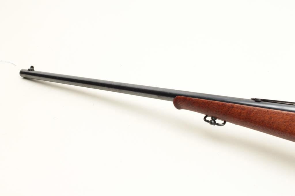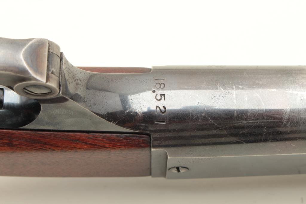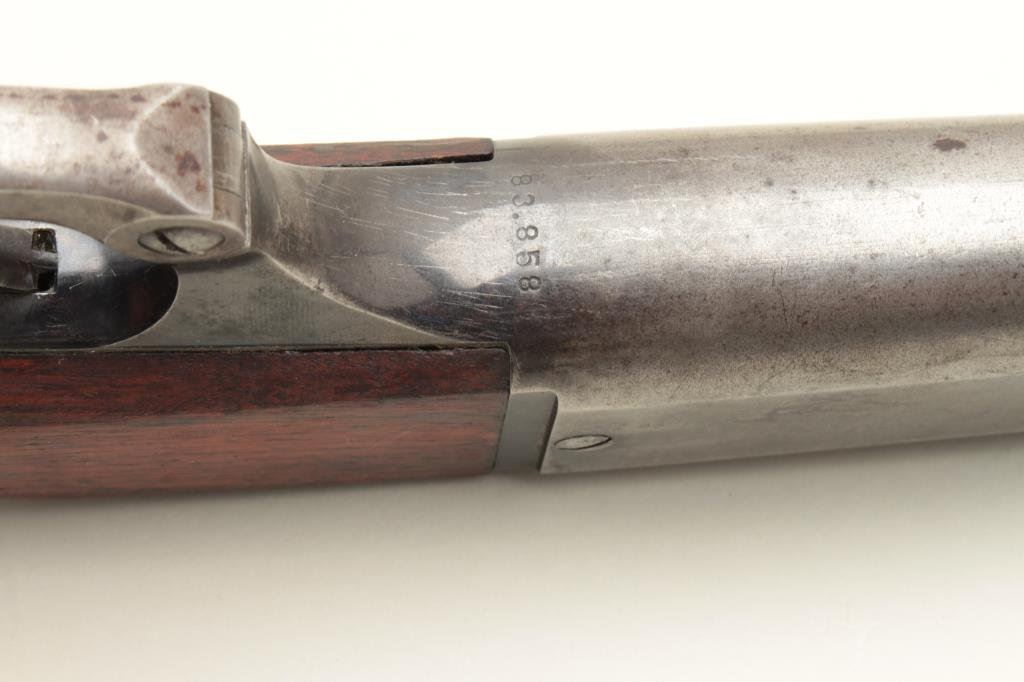 barrel, blued finish, wood stocks, S/N 83.858, in overall fair to good condition with a crisp action and sharp barrel address, dark bore, good forend, butt stock shows old repairs and scattered old mars and dings from carry and storage. (C&R) Est.: $400-$800.